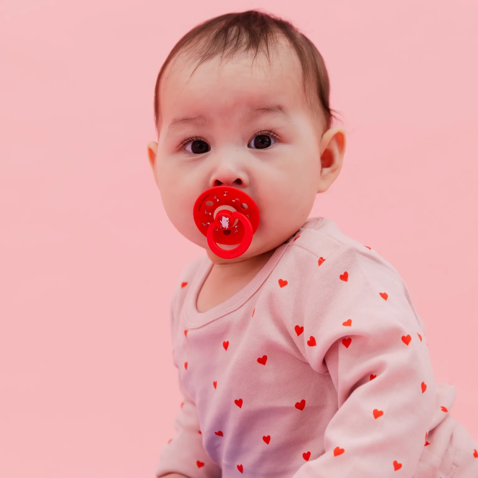 Super søde Bibs x Moomin sutter i str. 2 i rød og rosa med print af dansende Moomins.