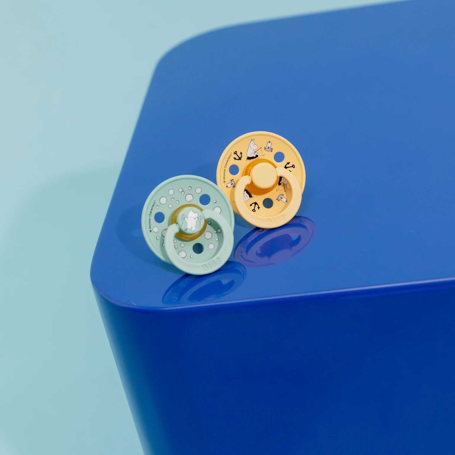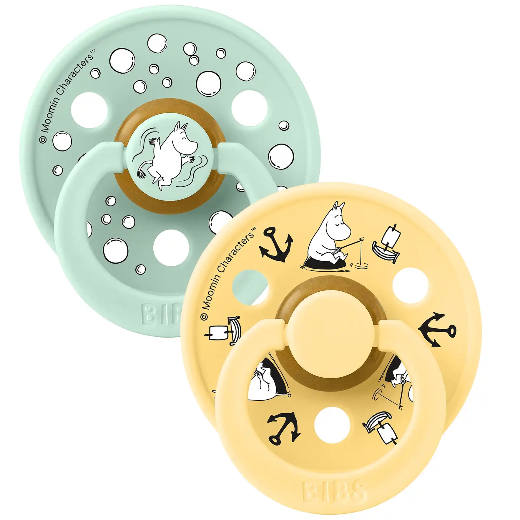 Super søde Bibs x Moomin sutter i str. 2 i pastelgrøn og gul med print af Moomins.