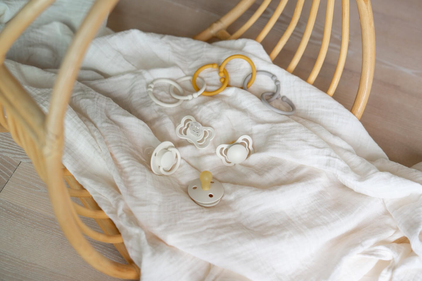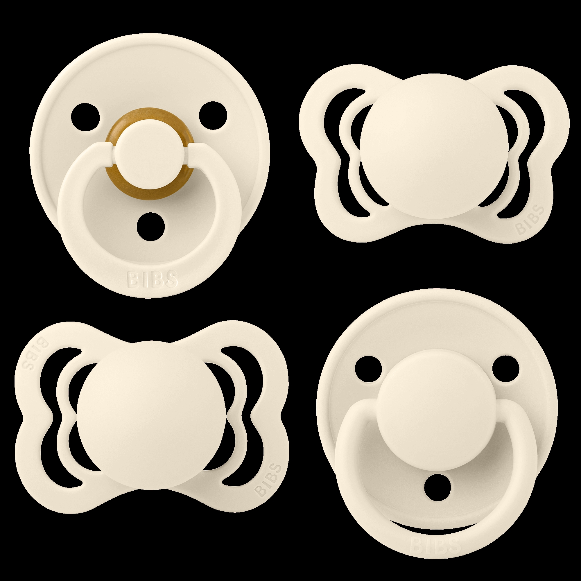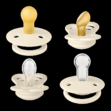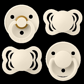 En pakke med 4 forskellige Bibs sutter i en flot råhvid nuance.