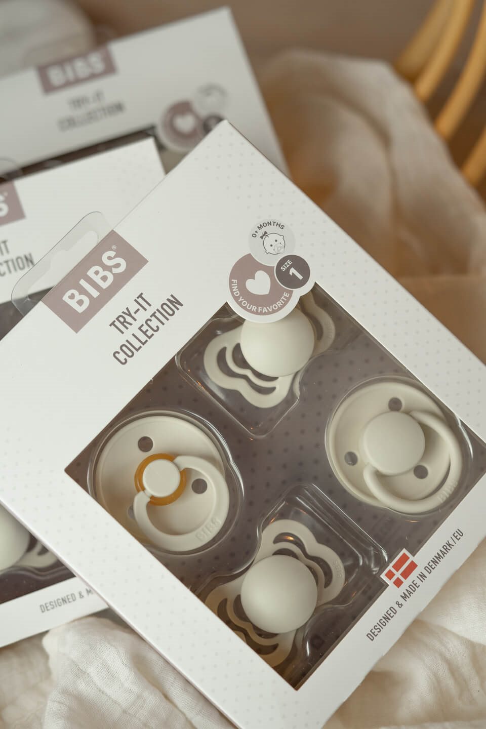 Det kan være nødvendigt at prøve forskellige former og størrelser for at finde den perfekte pasform til dit barn. Derfor er Bibs Try-it-kollektion et godt sted at starte for at finde den rette sut.