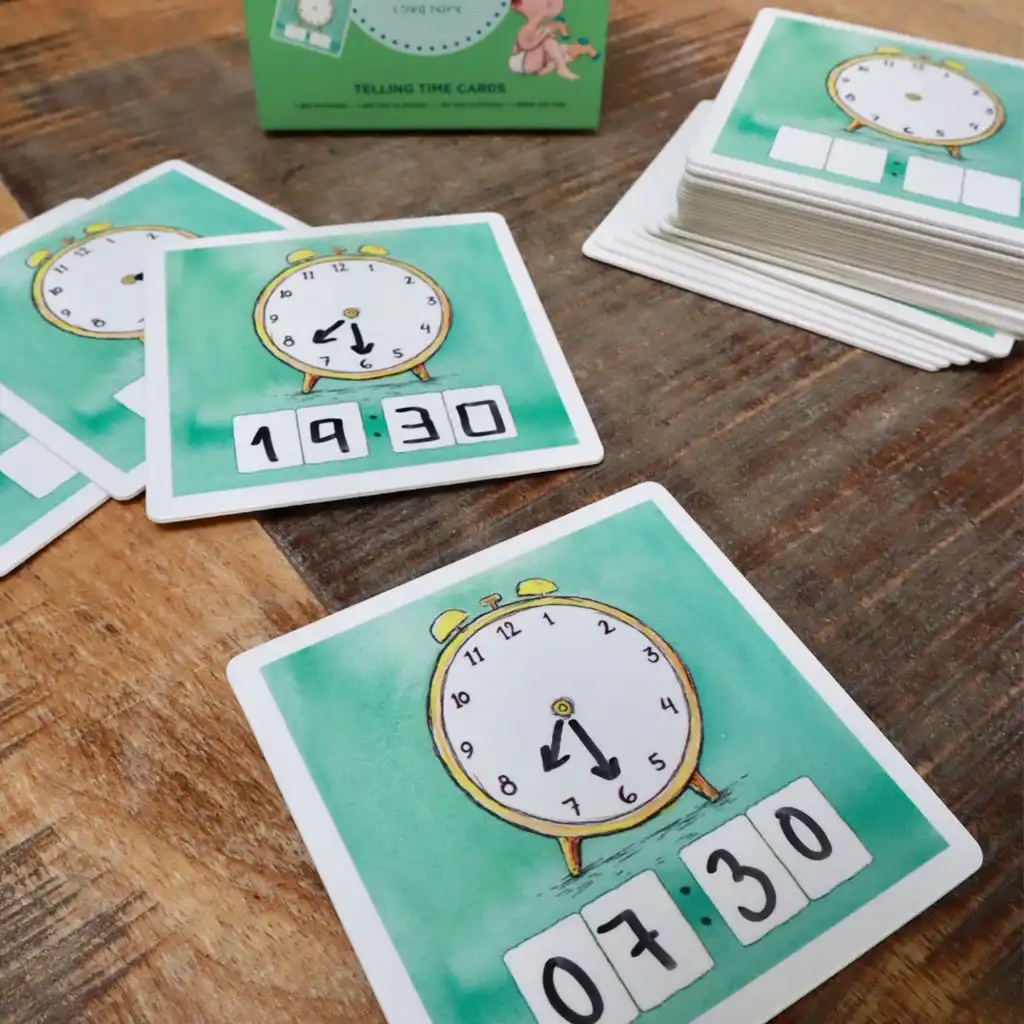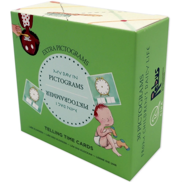 Pakken indeholder 30 piktogram kort med ur, hvor I selv kan udfylde både urets visere og tallene for det digitale ur.