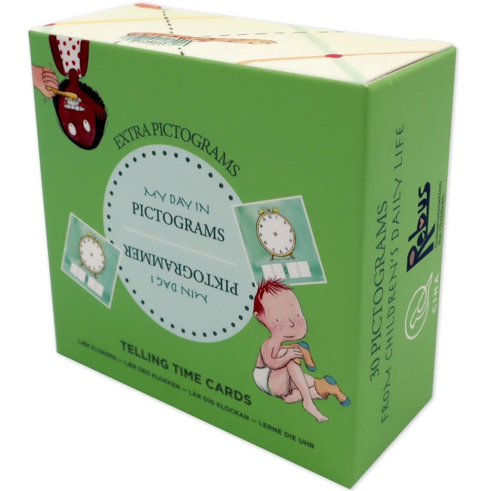 Brug piktogrammerne til at lære barnet klokken og til at navigere gennem dagen sammen med den gode basis piktogram æske ‘Min dag i piktogrammer‘.