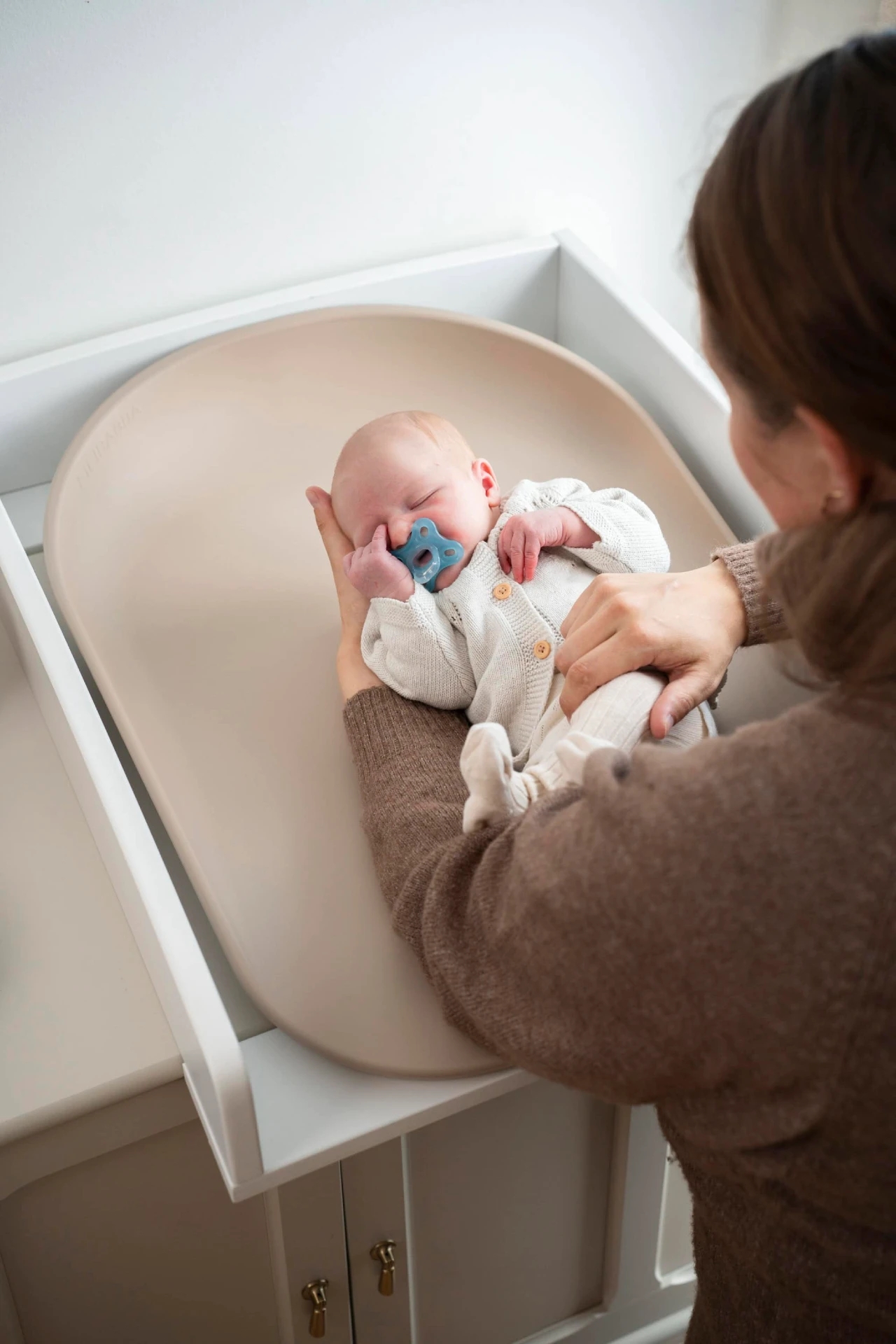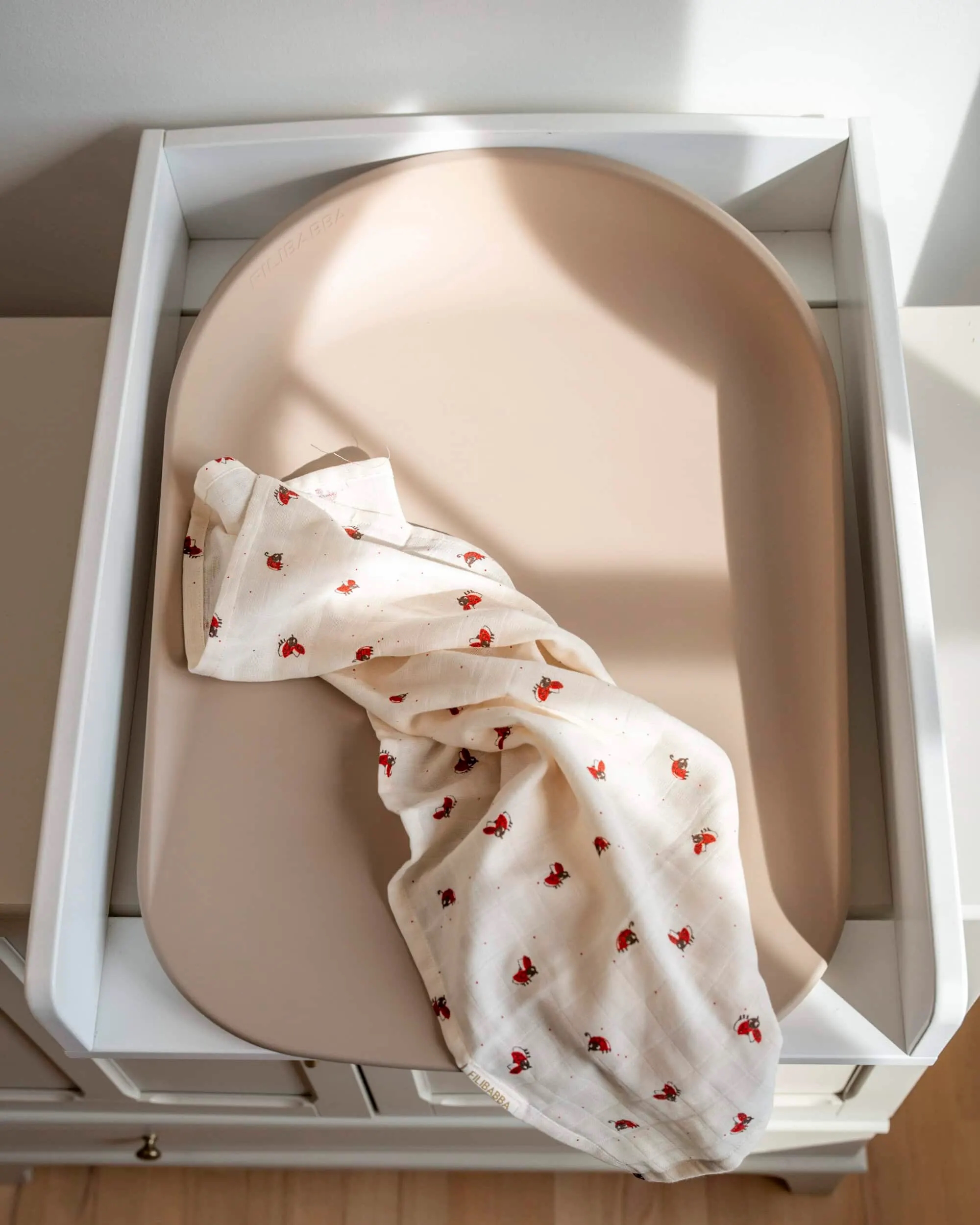 Det gennemtænkte design med de forhøjede kanter skaber en tryg og stabil ramme om barnet, mens den vandafvisende overflade sikrer en let rengøring. Den dæmpede beige nuance passer smukt ind i de fleste nordiske hjem og skaber en rolig atmosfære ved puslebordet.