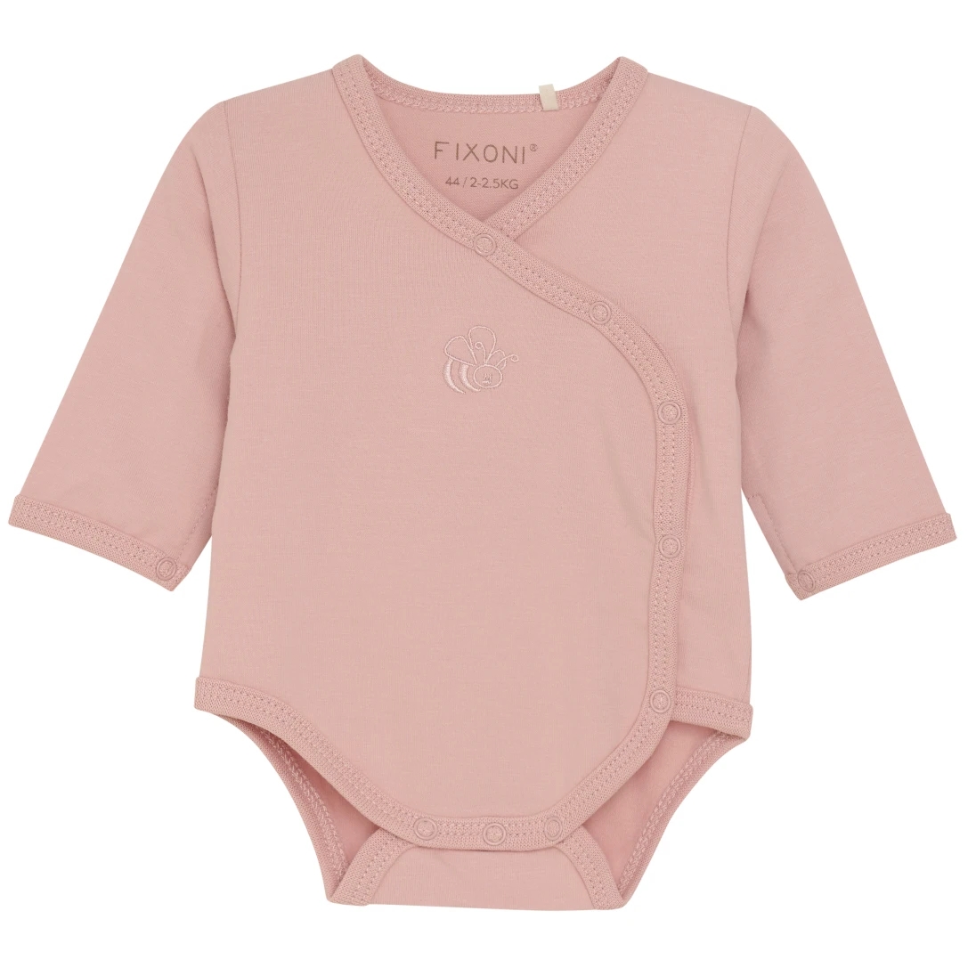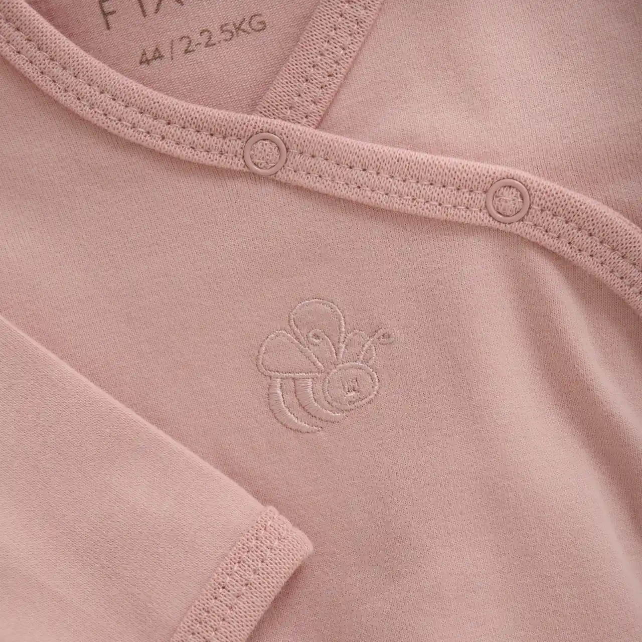 Fixoni bodyen er i en flot, støvet rosa med en sød, broderet bi foran.