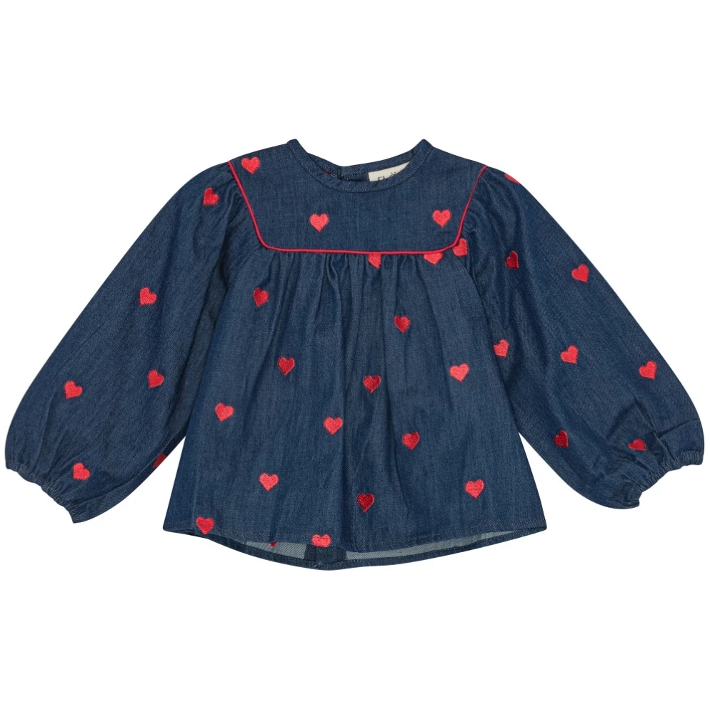 Flöss blusen er lavet i blå, let vævet denim med smukt hjertebroderi.
