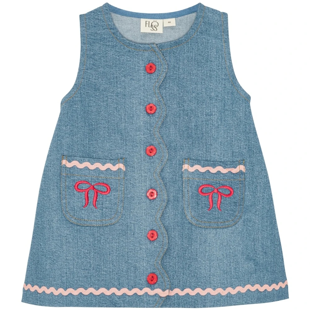 Flöss kjolen er medium blå og har rund hals, to forlommer med sødt sløjfe­broderi, bølgeformet stolpe og røde knapper. Derudover er der pink kontrast­detaljer på lommerne og nederste kant, som gør den så yndig.