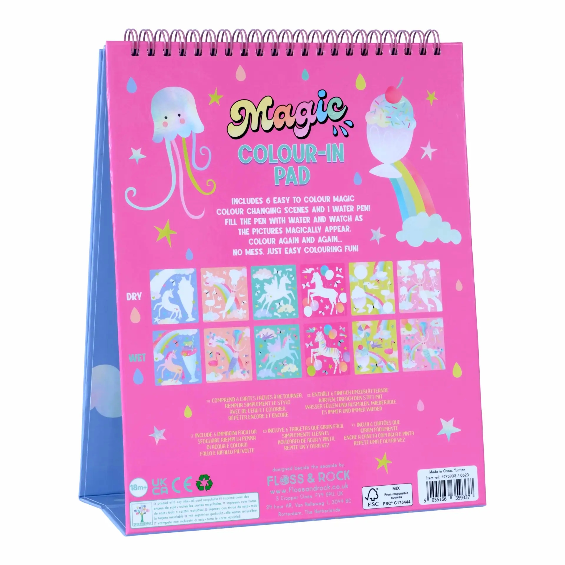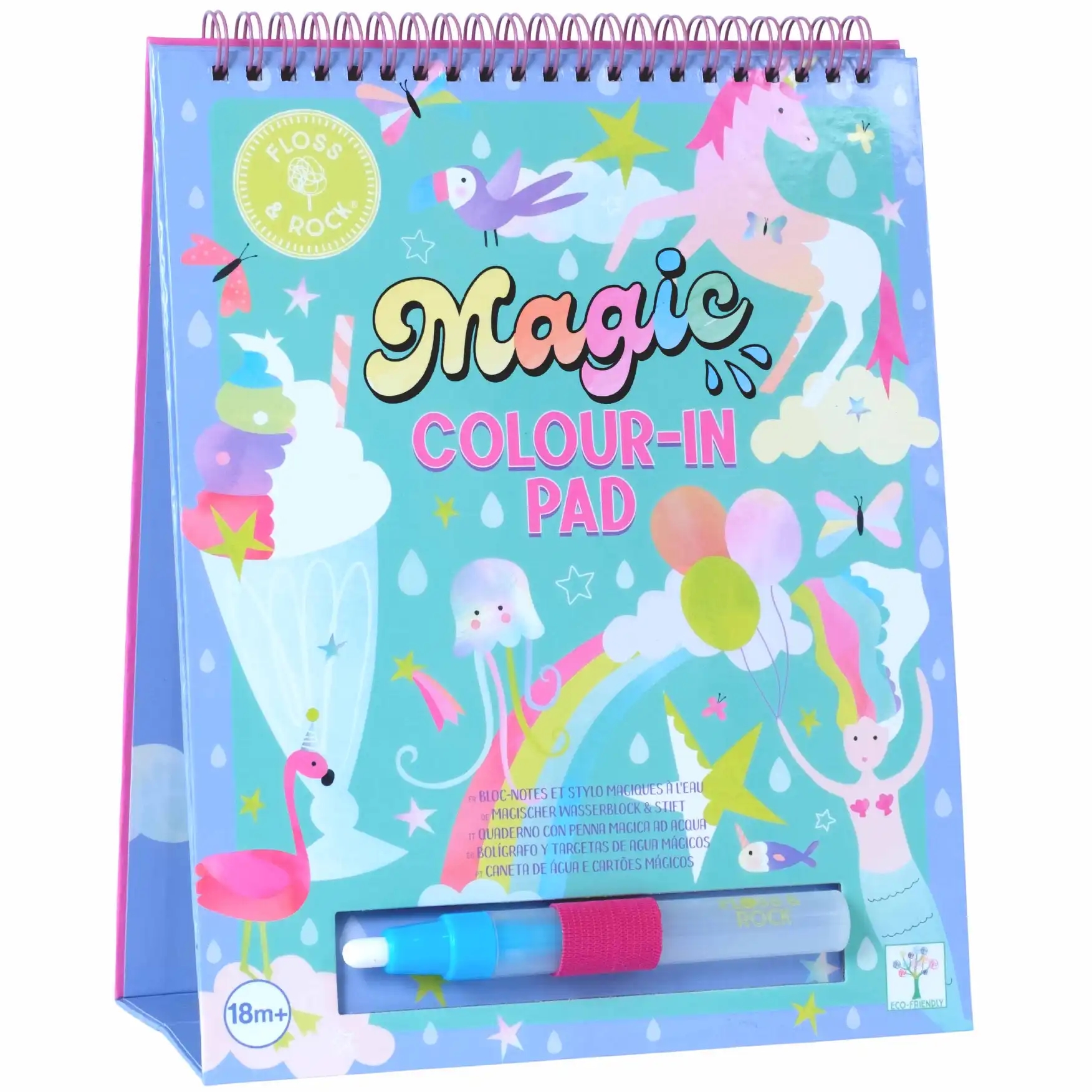 Floss & Rock vandmalebogen indeholder 6 farvestrålende sjove ark, som holdes sammen i en spiralbundet blok, så de kan vendes om, når de er malet færdige. Det indbyggede staffeli kan bruges som en 'rigtig' kunstner! Blokken kan genbruges igen og igen, og barnet vil have så meget sjov med at afsløre de farverige regnbuer, feer, enhjørninger og dyr!