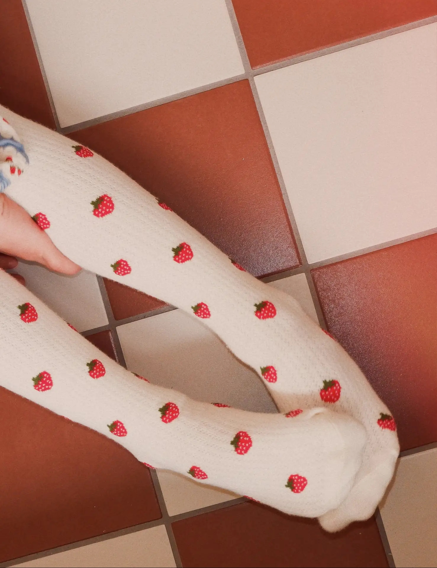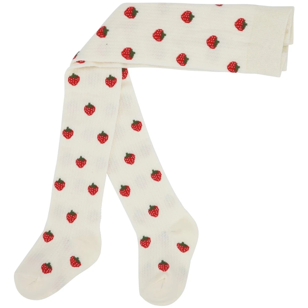 Super fine Flöss strømpebukser i cremehvid med et sødt jordbær print og er lavet med pointelle hulmønster, som gør dem så yndige.