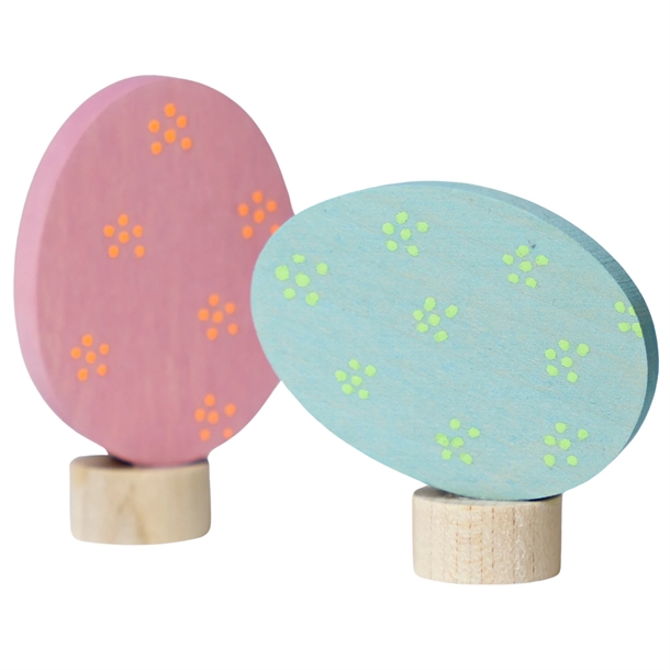 Flotte påskeæg i turkis og rosa fra Grimms, som kan sættes i års- og fødselsdagsringene.