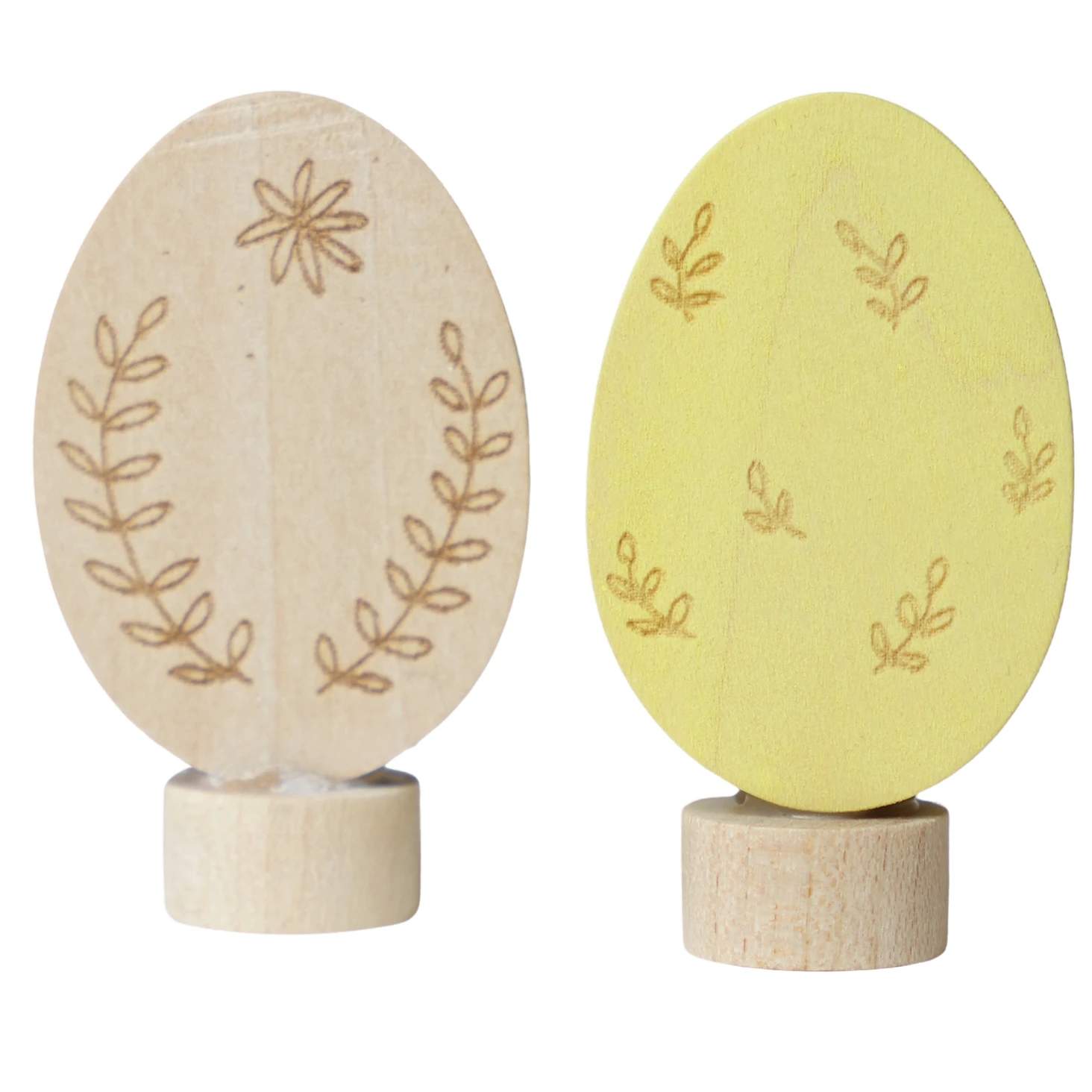 Super fine Grimms påskeæg i gul og naturligt træ dekoreret med håndtegnede små, fine blomster. Påskeæggene passer til års- og fødselsdagsringene og pynter så fint på påske.