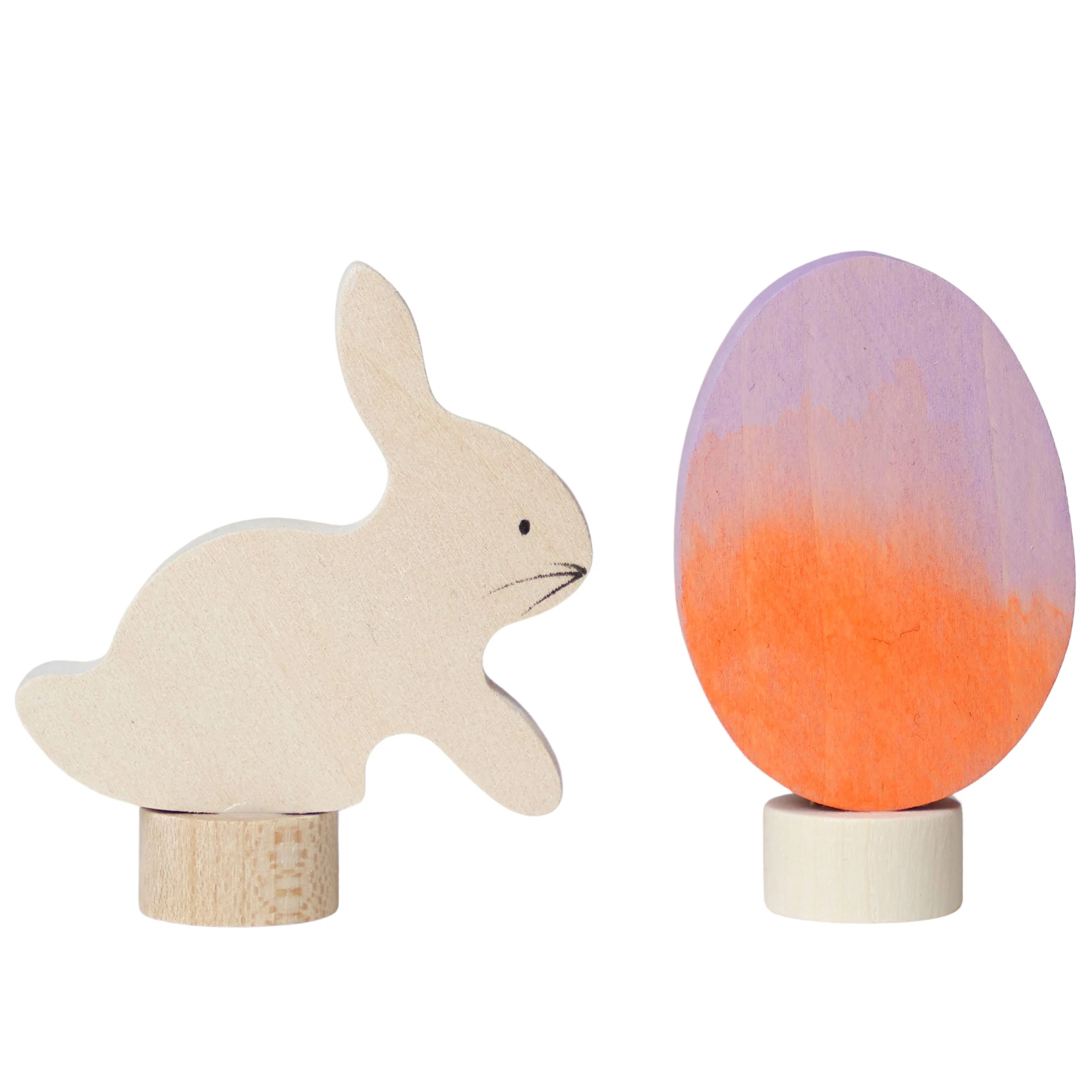 Et fint påskesæt fra Grimms med en påskehare og et påskeæg i flotte orange og lilla nuancer, som kan sættes i års- og fødselsdagsringene og pynter så fint til påske.