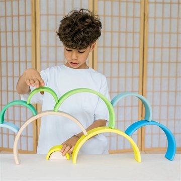Grimms regnbuen er perfekt både til små og store børn. Den er god til de mindste, som stadig er ved at øve motorikken og den logiske sans. Buerne i regnbuen passer alle sammen, så de mindste kan træne i at finde den rigtige rækkefølge.