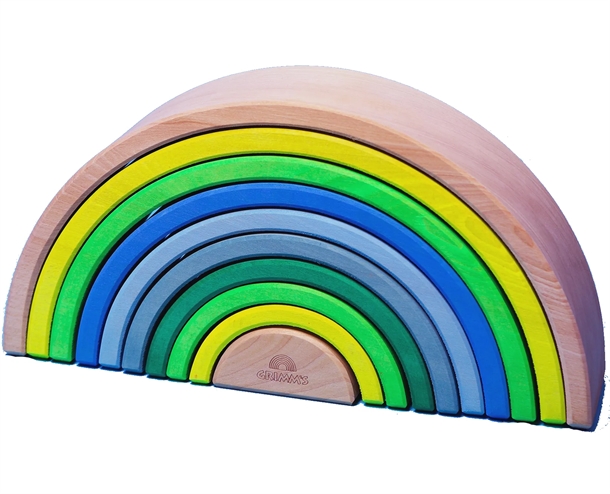 Grimms regnbuen er med 10 buer i træ i flotte grønne, blå og gule farver.