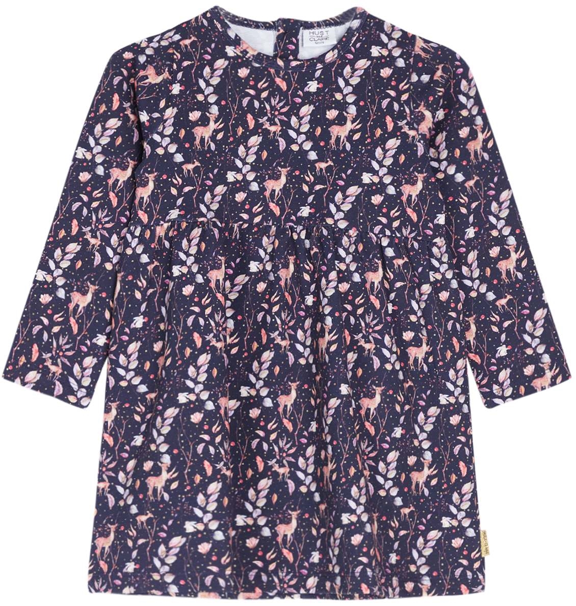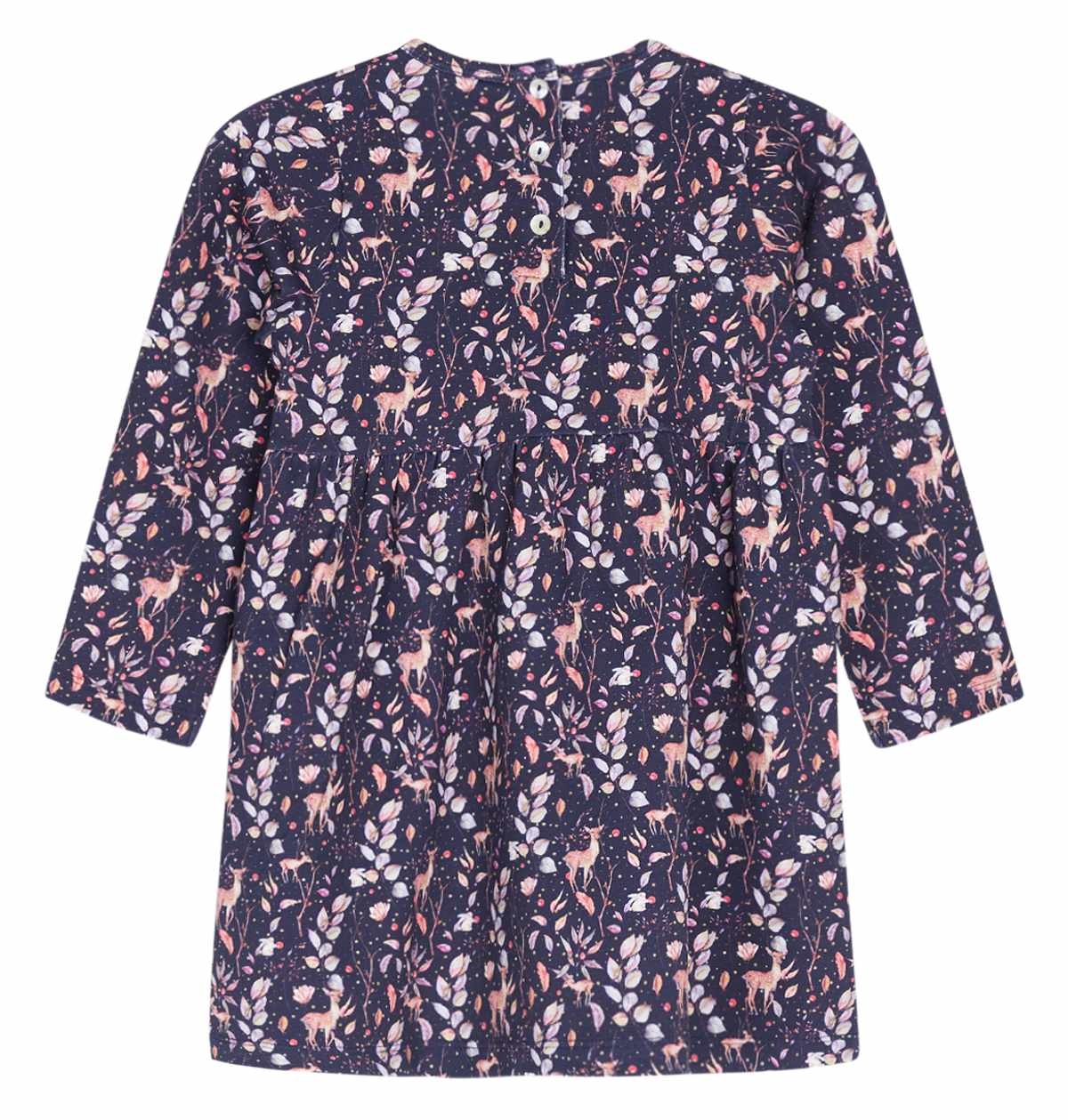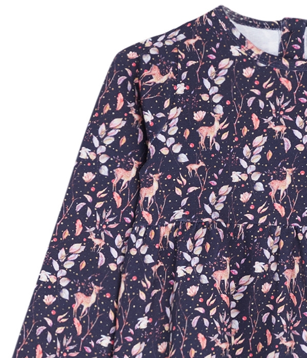 Kjolen er i en flot, dyb mørkeblå nuance med et superfint print med dådyr, blade og bær i smukke farver.