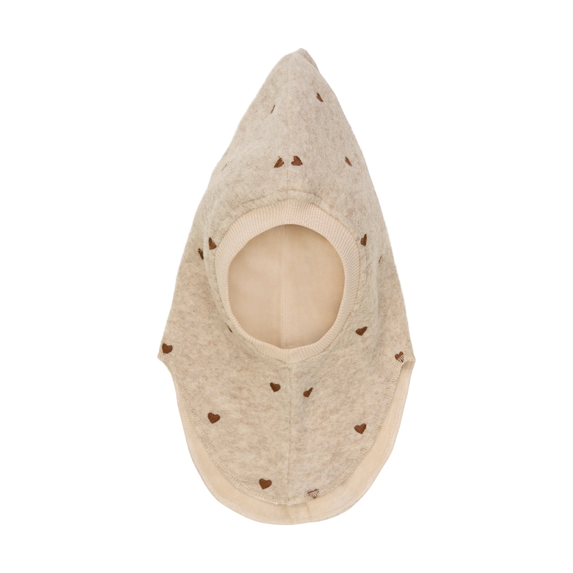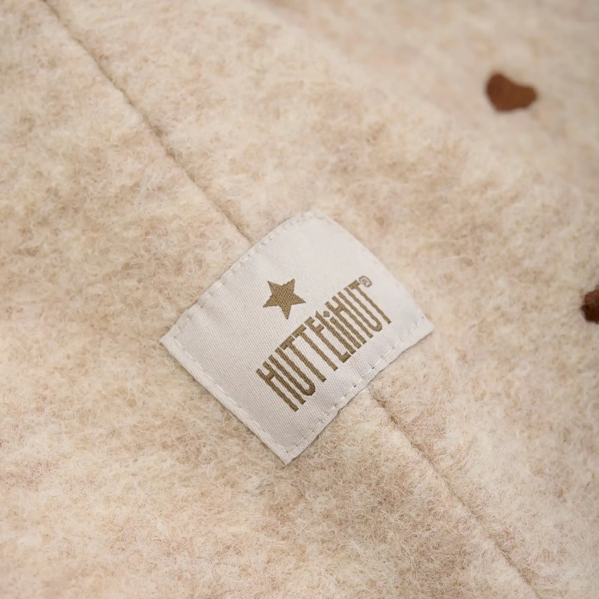 Huttelihut huen er i en flot, meleret sandfarve med brune broderede hjerter.