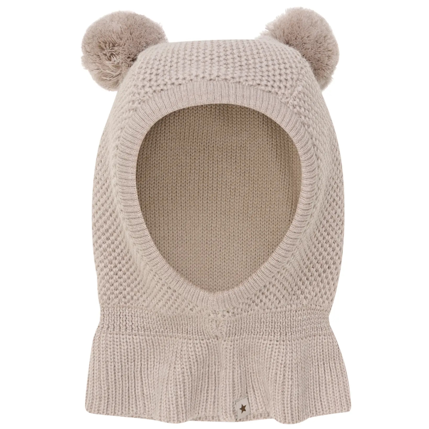 Huttelihut huen er strikket i flot, meleret sandfarve og er med to søde kvaster på toppen.