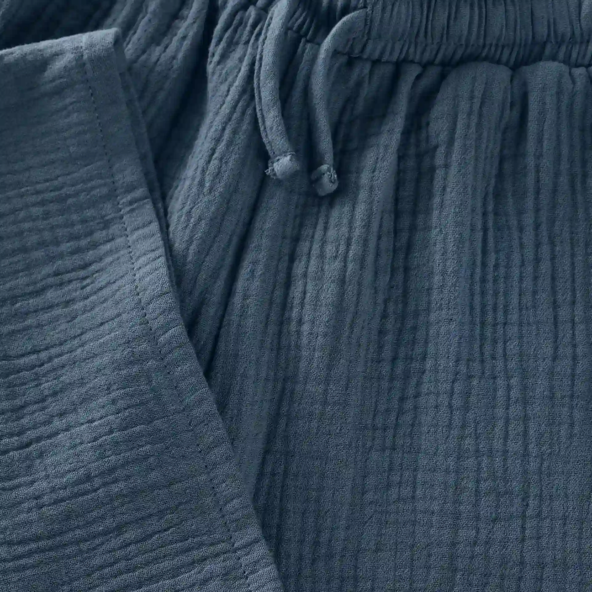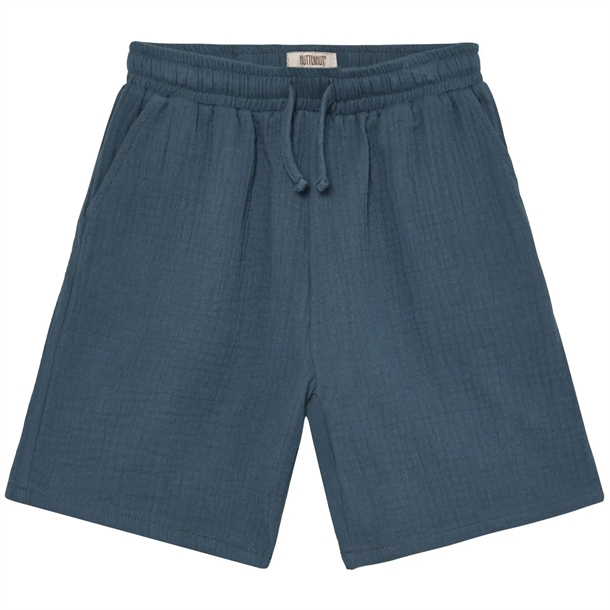 Huttelihut shortsene er i flot, ensfarvet blå og er lavet i blødt økologisk bomuldsmuslin.