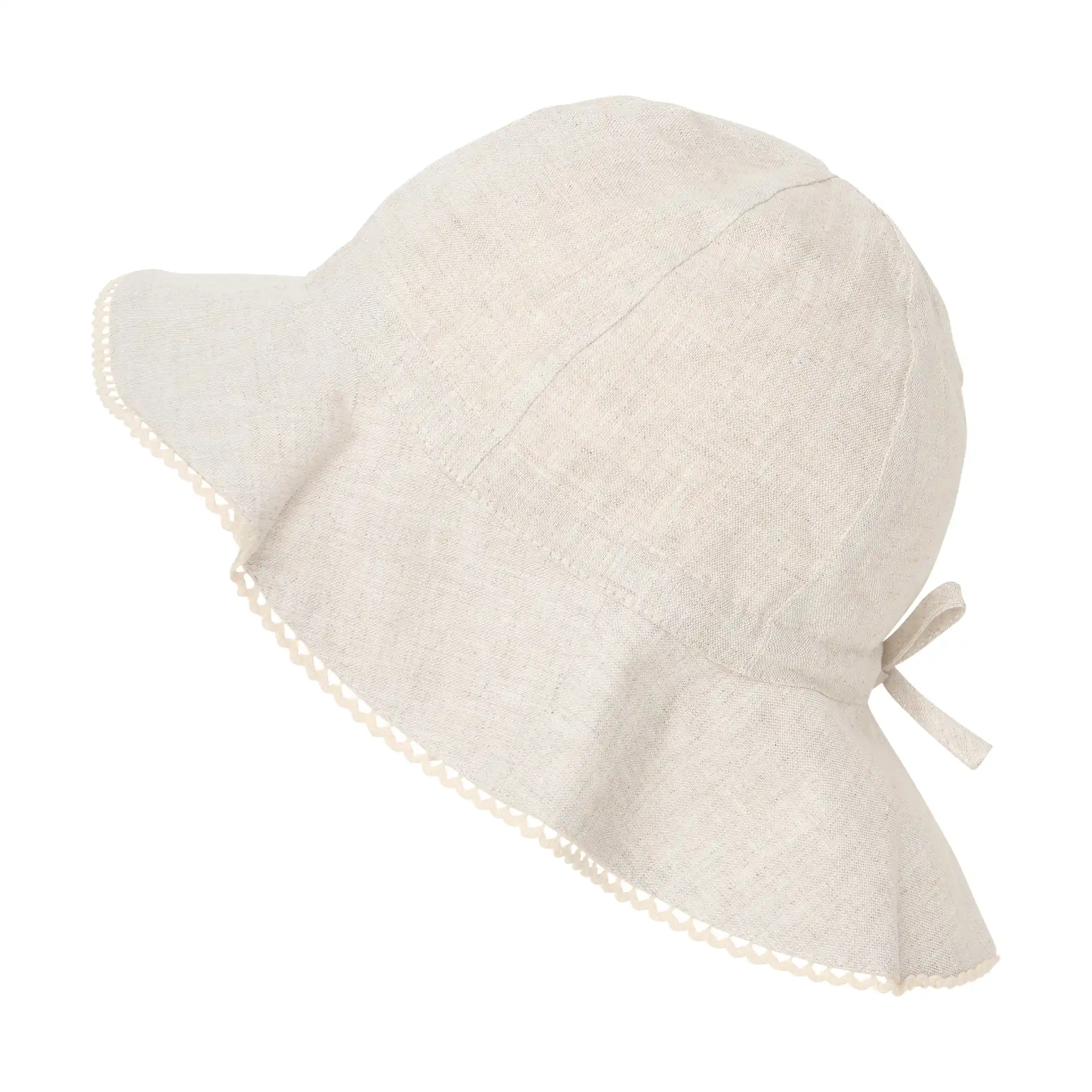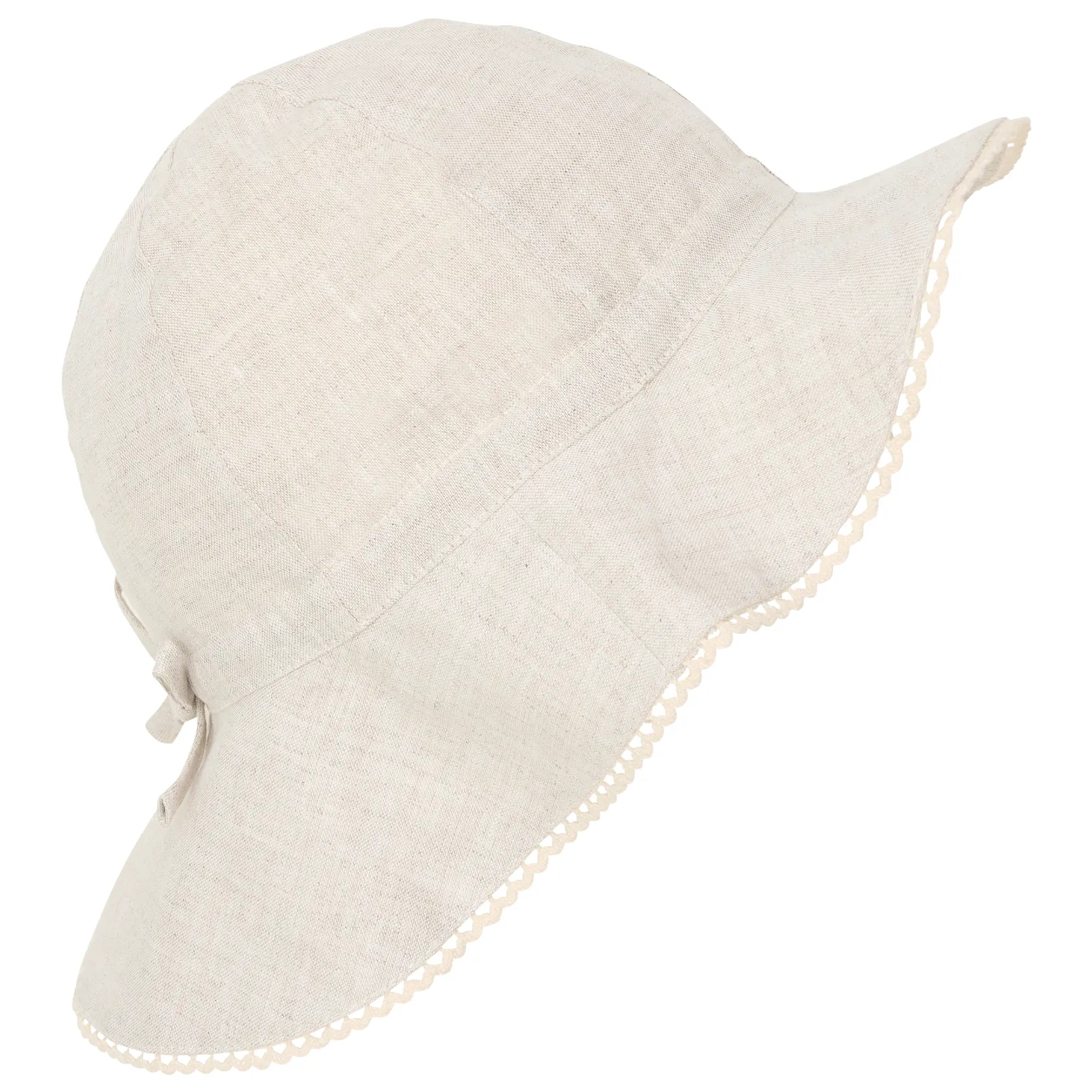 Huttelihut solhatten er i flot, ensfarvet beige hør lavet med en flot solskærm med en fin kant med detaljer.