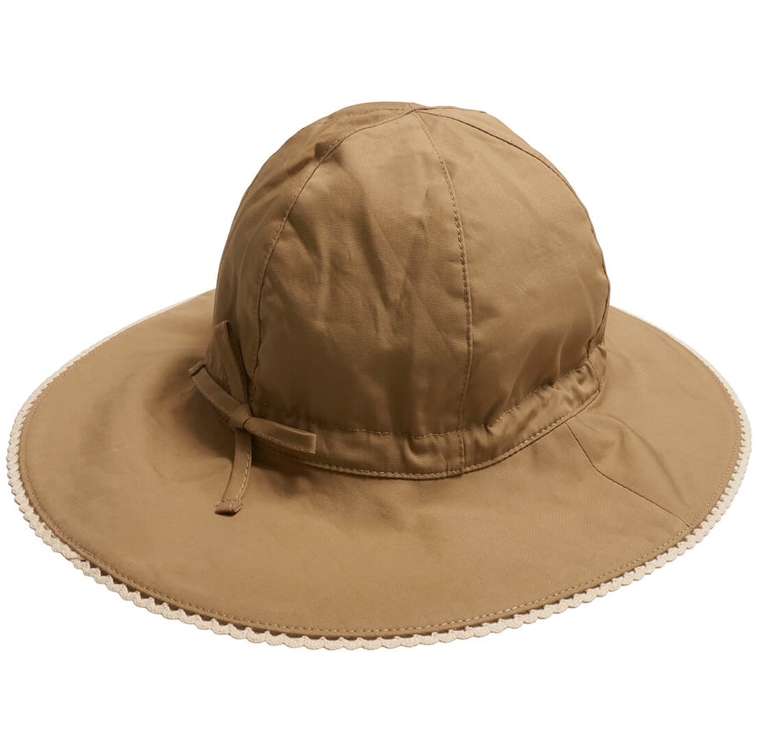 Huttelihut solhatten er khakifarvet med en fin cremefarvet blondekant.