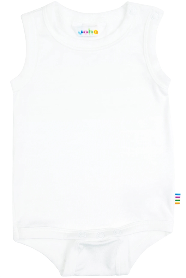 Joha bodyen uden ærmer har trykknapper på den ene skulder samt mellem benene.