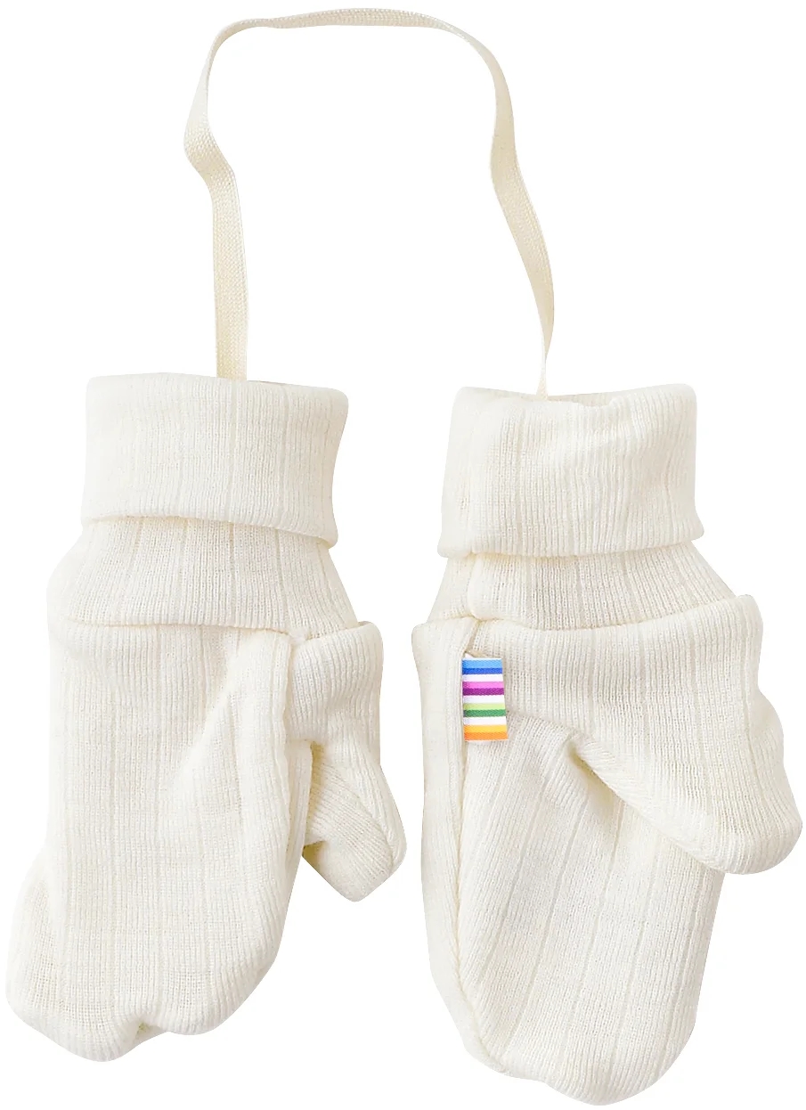 De har en bred ribkant og snørestop ved håndleddet, så de ikke falder af, samt en praktisk snor til at trække igennem jakken, så vanterne ikke mistes.