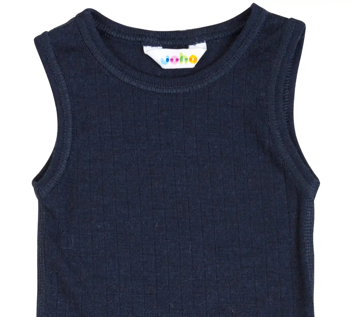 Joha uld bodyen er i mørkeblå lavet med rib.