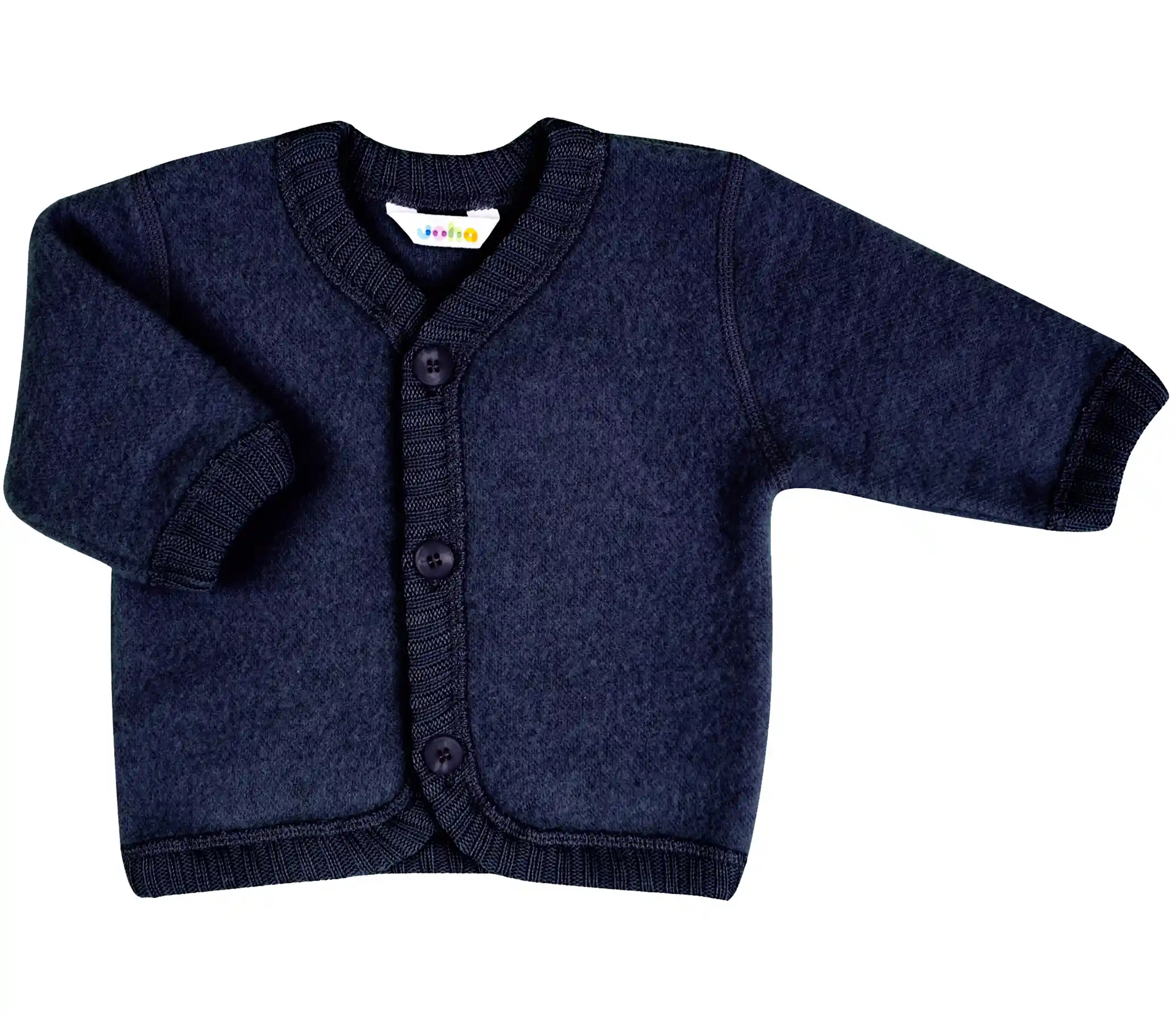 Joha cardiganen er i flot mørkeblå og lukkes foran med knapper.