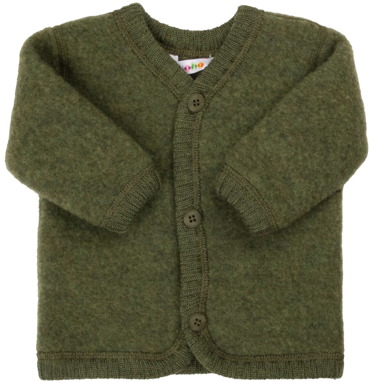 Joha cardiganen er i en flot, mørk oliven nuance og lukkes foran med knapper.