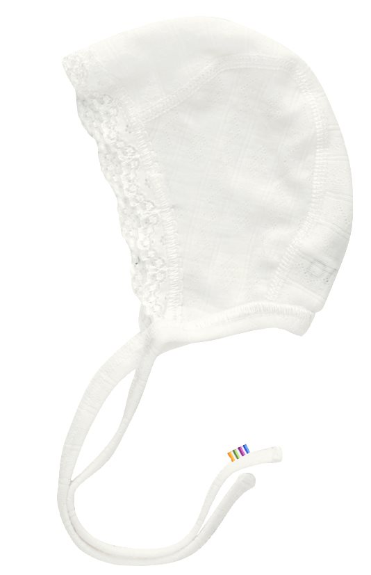 Joha huen er i råhvid og lavet i en flot kvalitet med hulmønster, samt blondekanter ved ansigtet.
