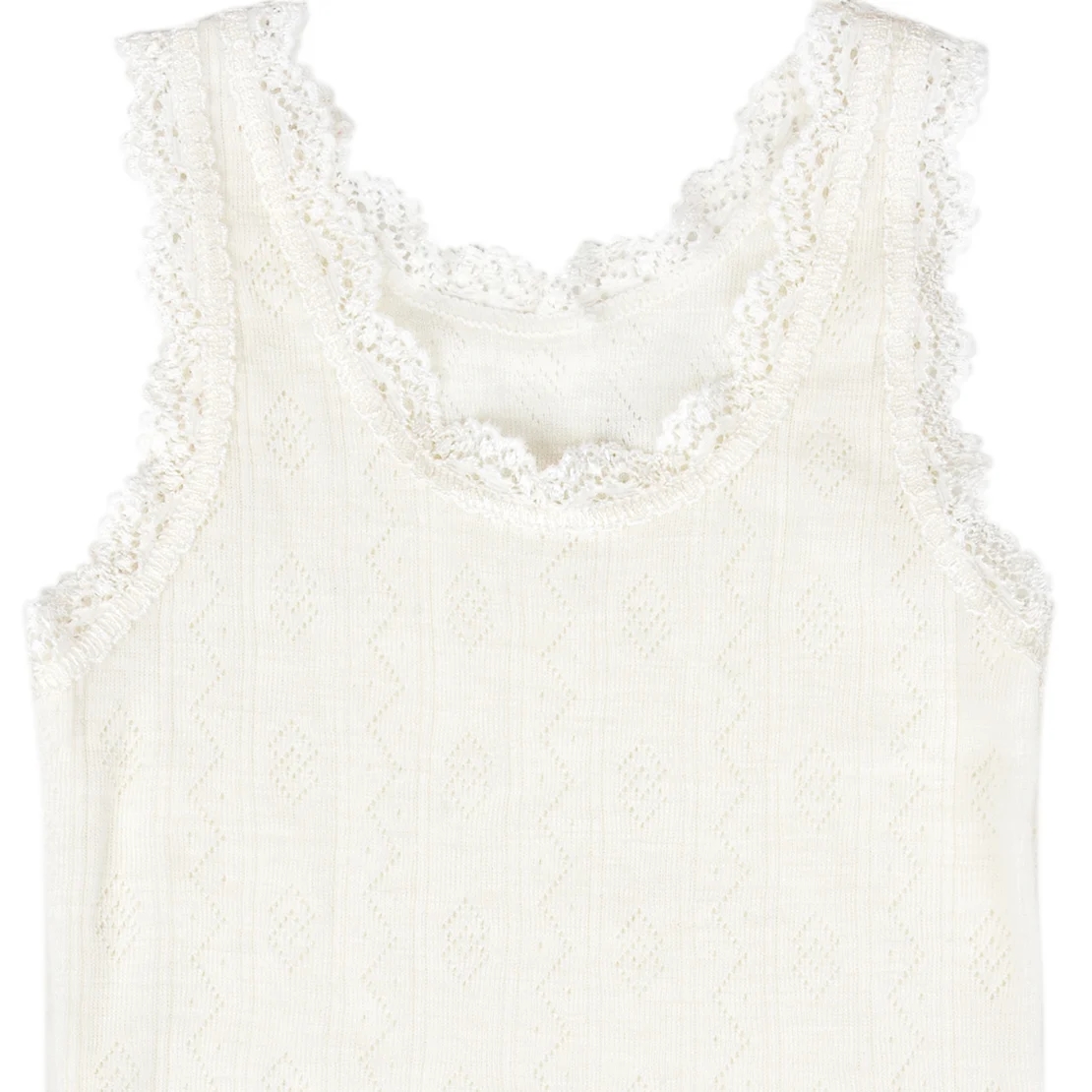 Undertrøjen er i en flot råhvid nuance og er lavet med hulmønster og blondekant, hvilket giver den et sødt og feminint udstryk.