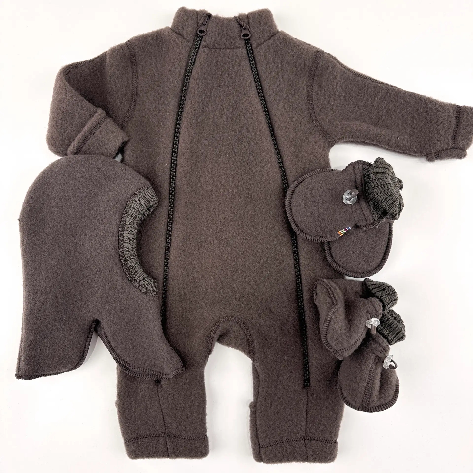 Joha ulddragten er lavet i brun merino uld med 2 i 1 ombuk ved hænder og fødder.