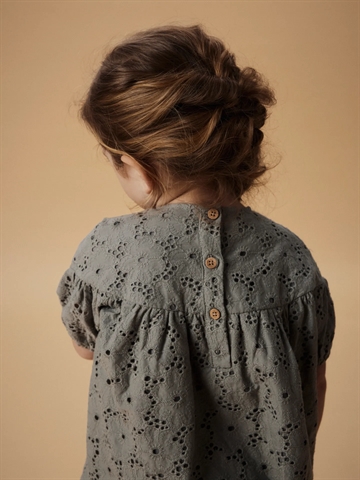 Lil Atelier blusen er kortærmet med elastik i ærmerne for god pasform. Den lukkes bagpå med pæne træknapper.