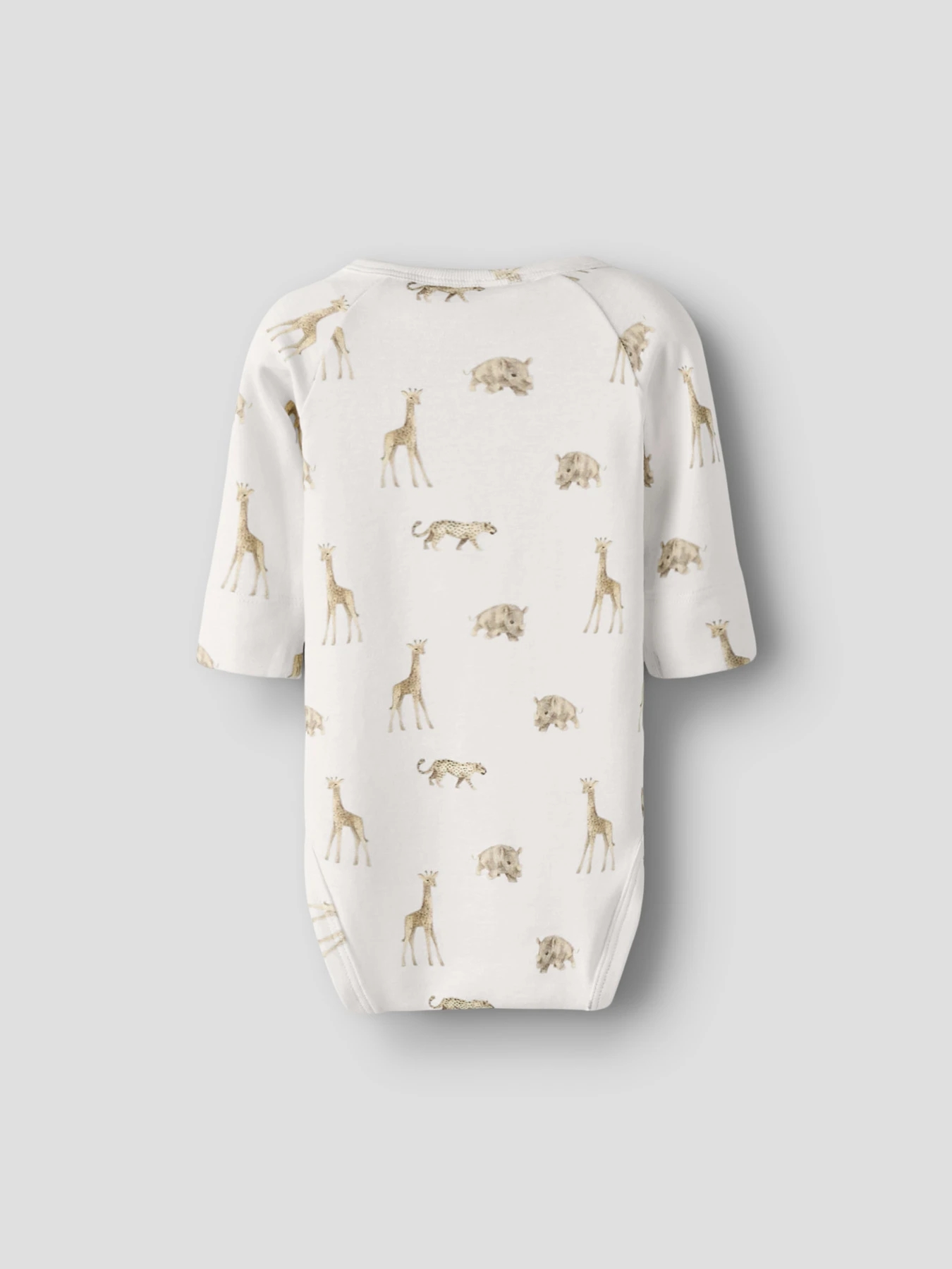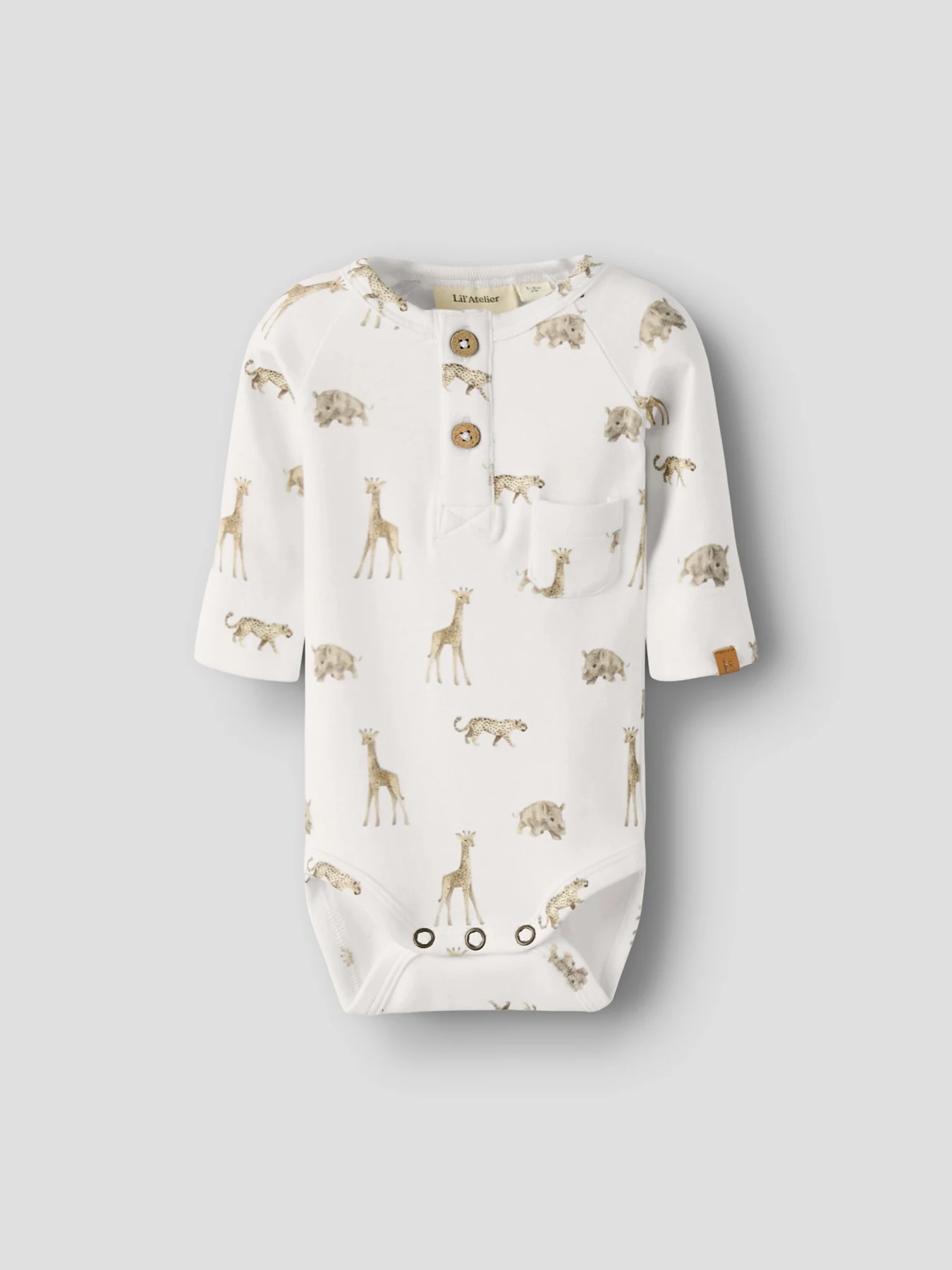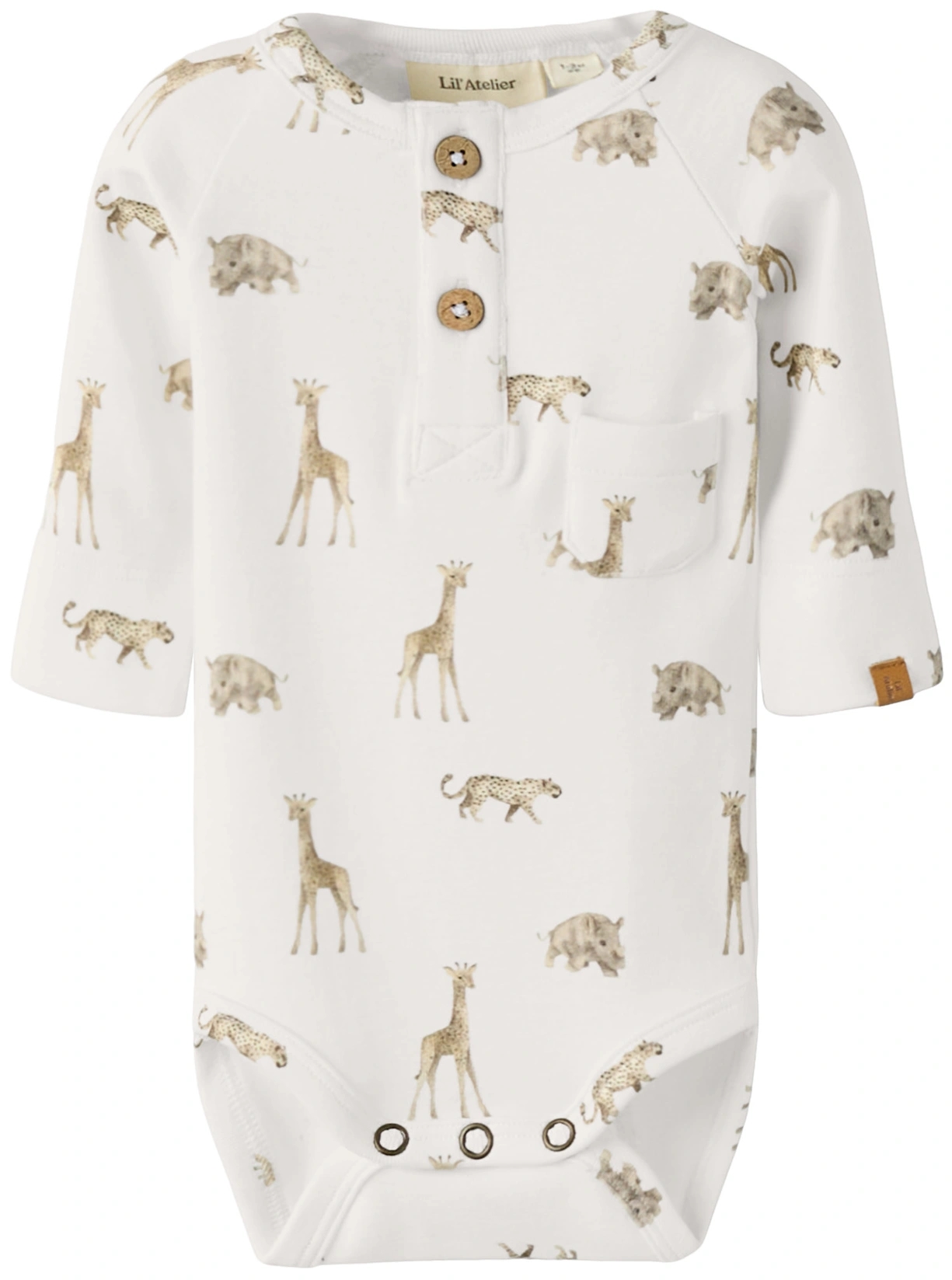 Lil Atelier bodyen er i cremehvid med et sødt print af savannedyr som giraffer, næsehorn og leoparder.