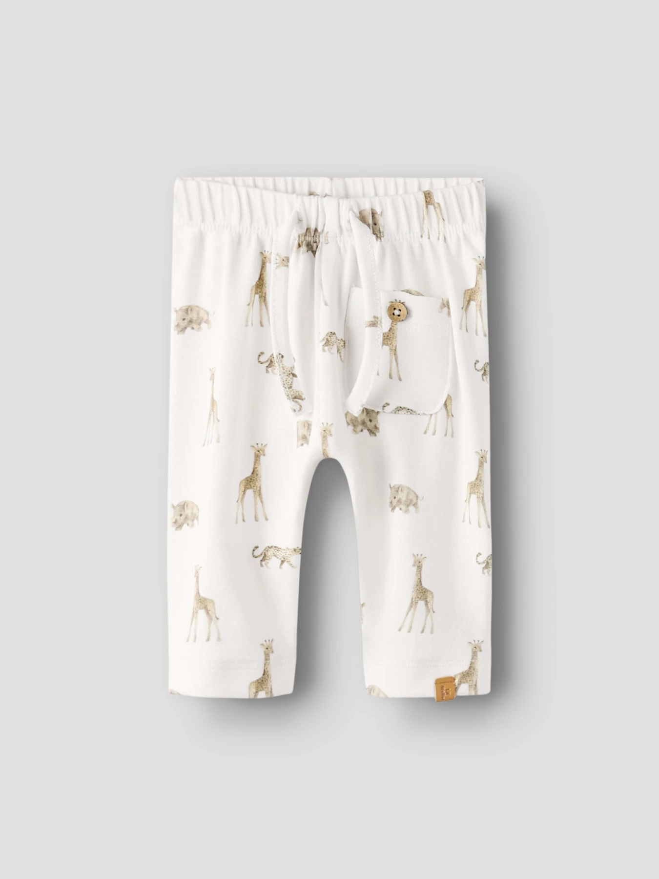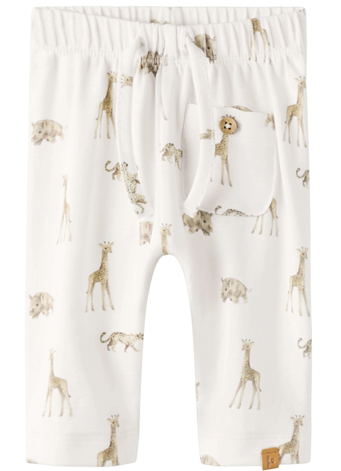 Lil Atelier bukserne er cremehvide med et sødt print af dyr fra den afrikanske savanne som giraffer, næsehorn og leoparder.