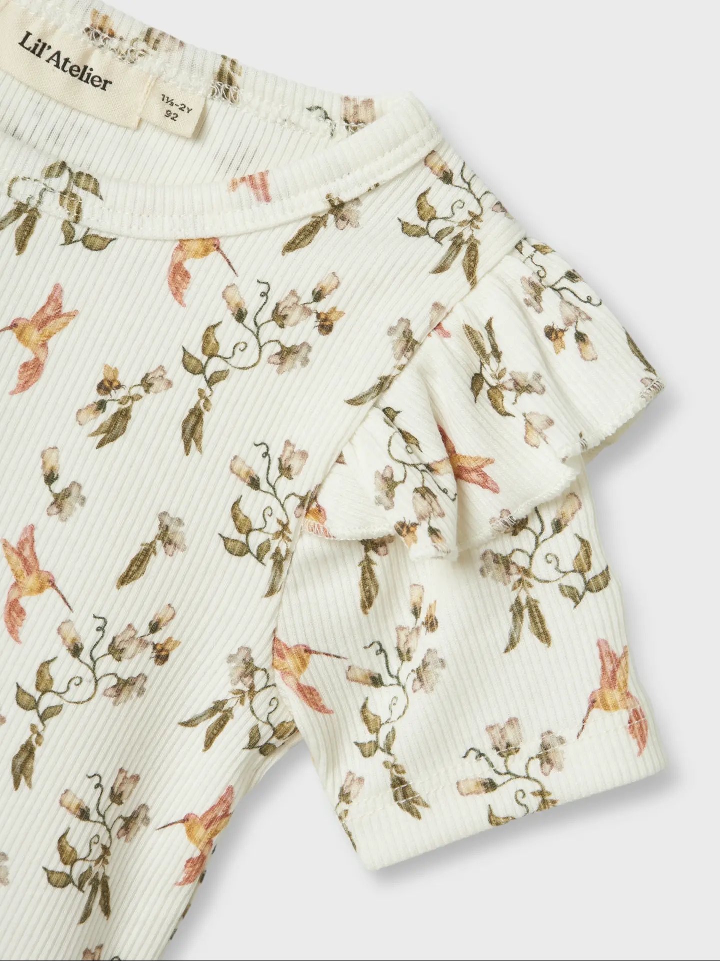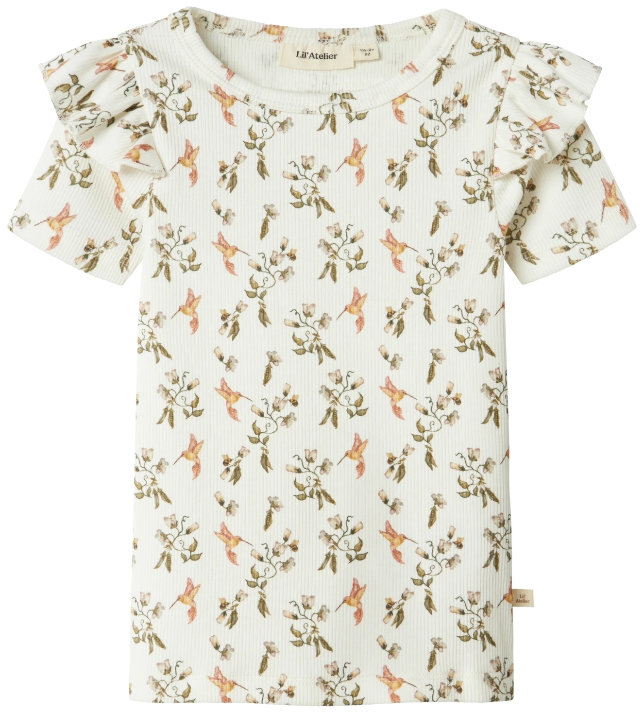 Lil Atelier T-shirten er i en flot lys farve med et smukt print af kolibrier og blomster.