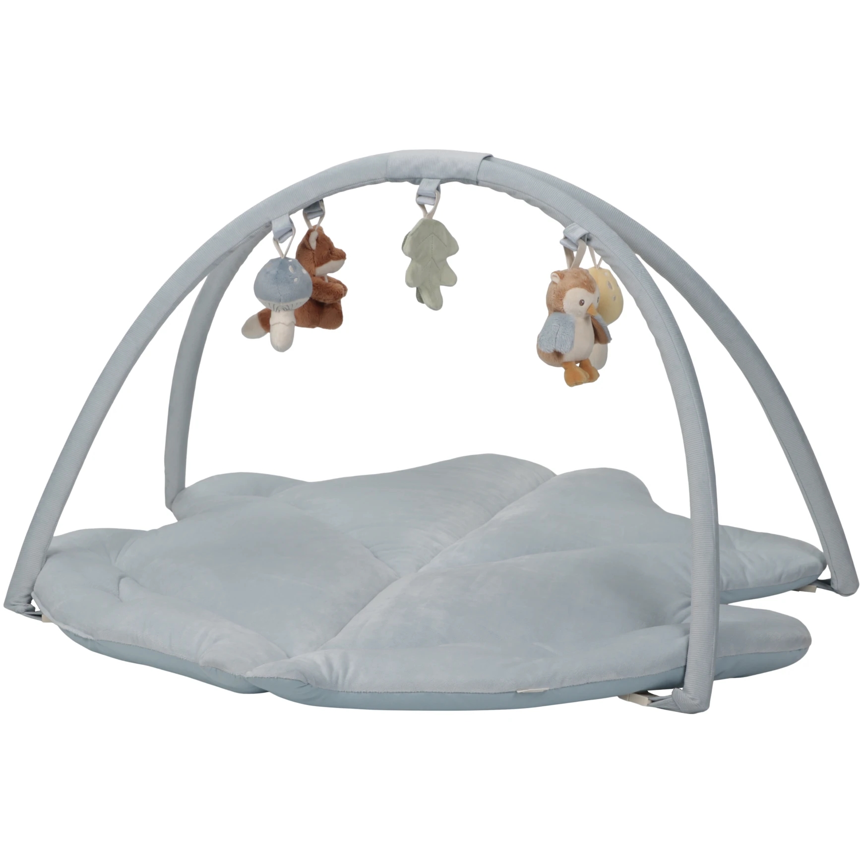 Et flot Little Dutch aktivitetstæppe i støvet blå med sødt plyslegetøj.