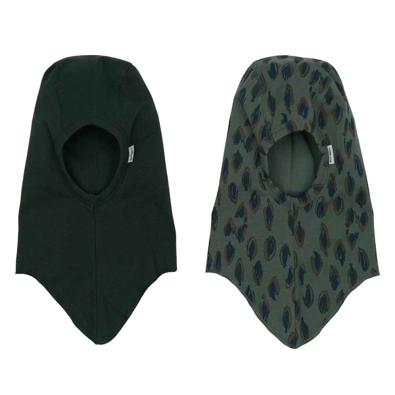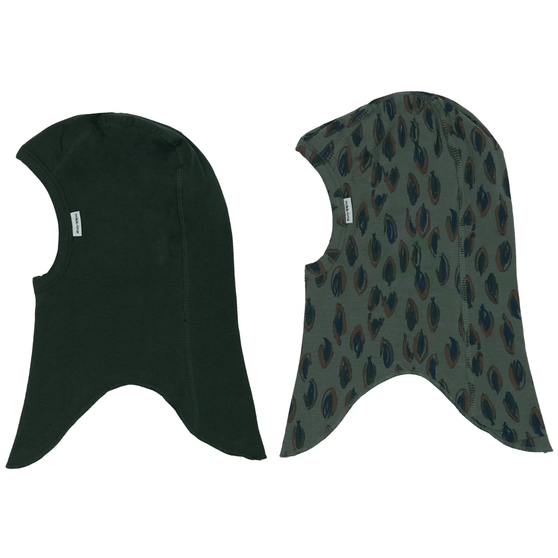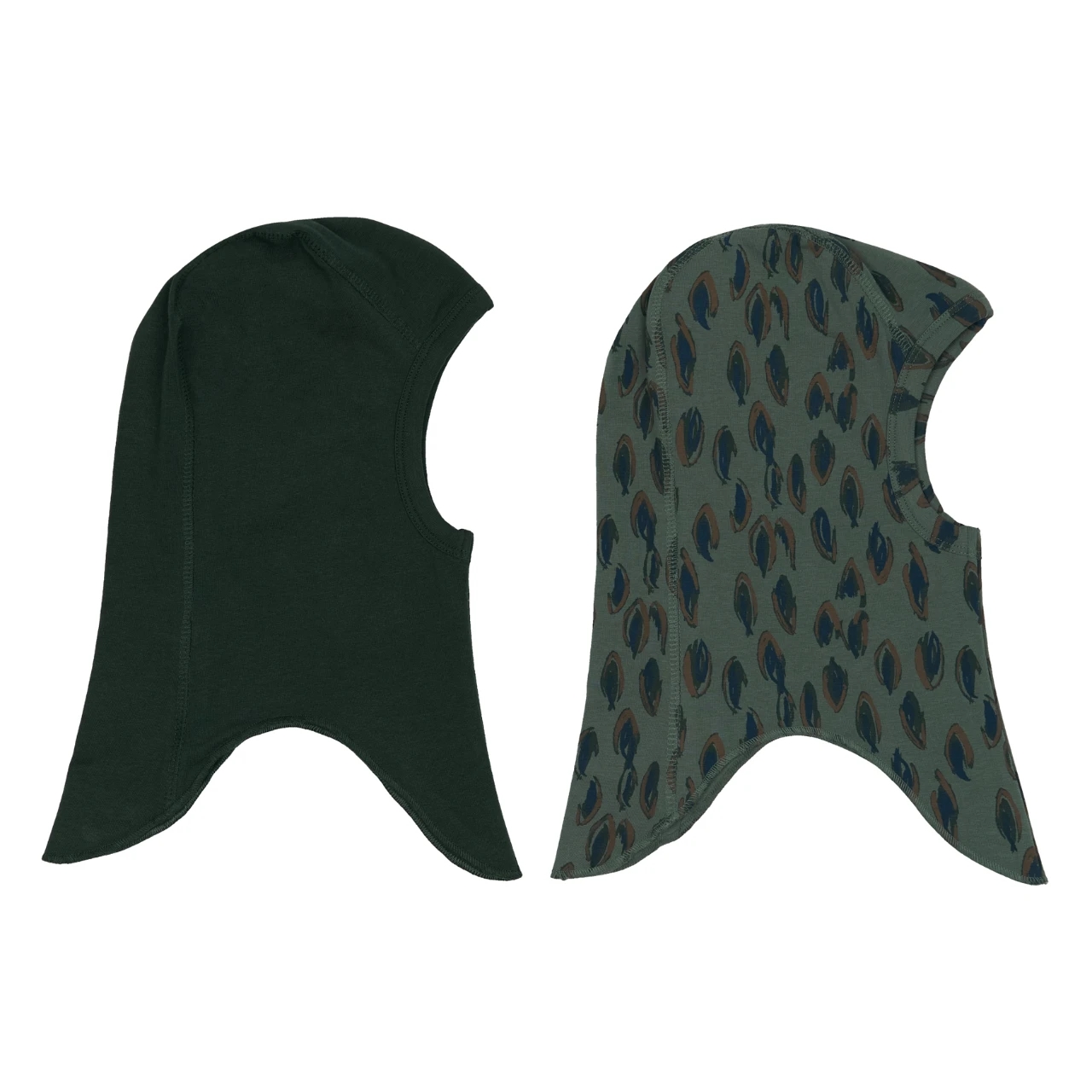 Sættet består af én ensfarvet elefanthue i mørkegrøn og én med et flot all-over-print i forskellige mønstre. Elefanthuerne dækker både hoved, hals og dele af ansigtet og er derfor ideelle til at holde dit barn varmt og godt beskyttet under udendørs leg og eventyr.
