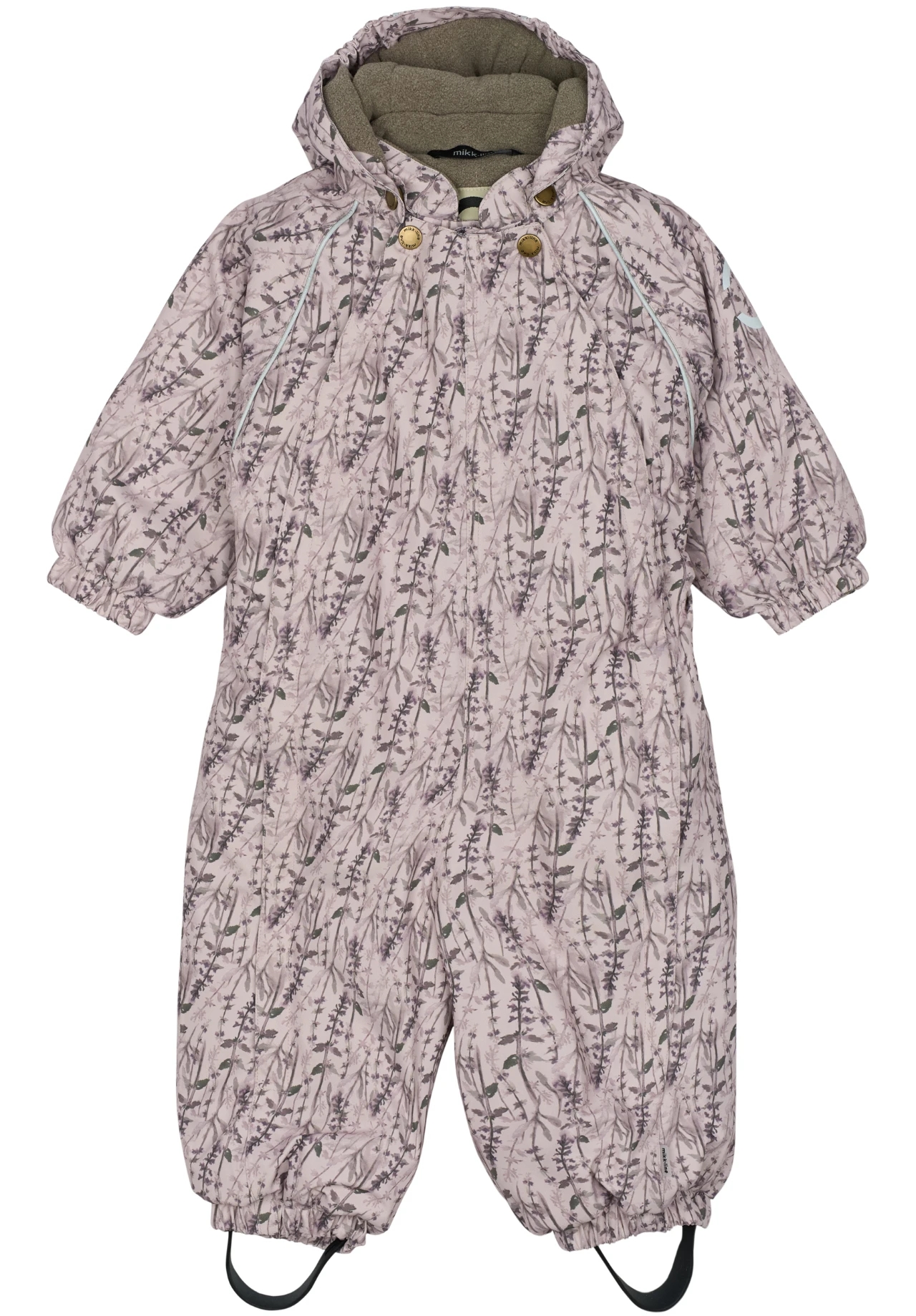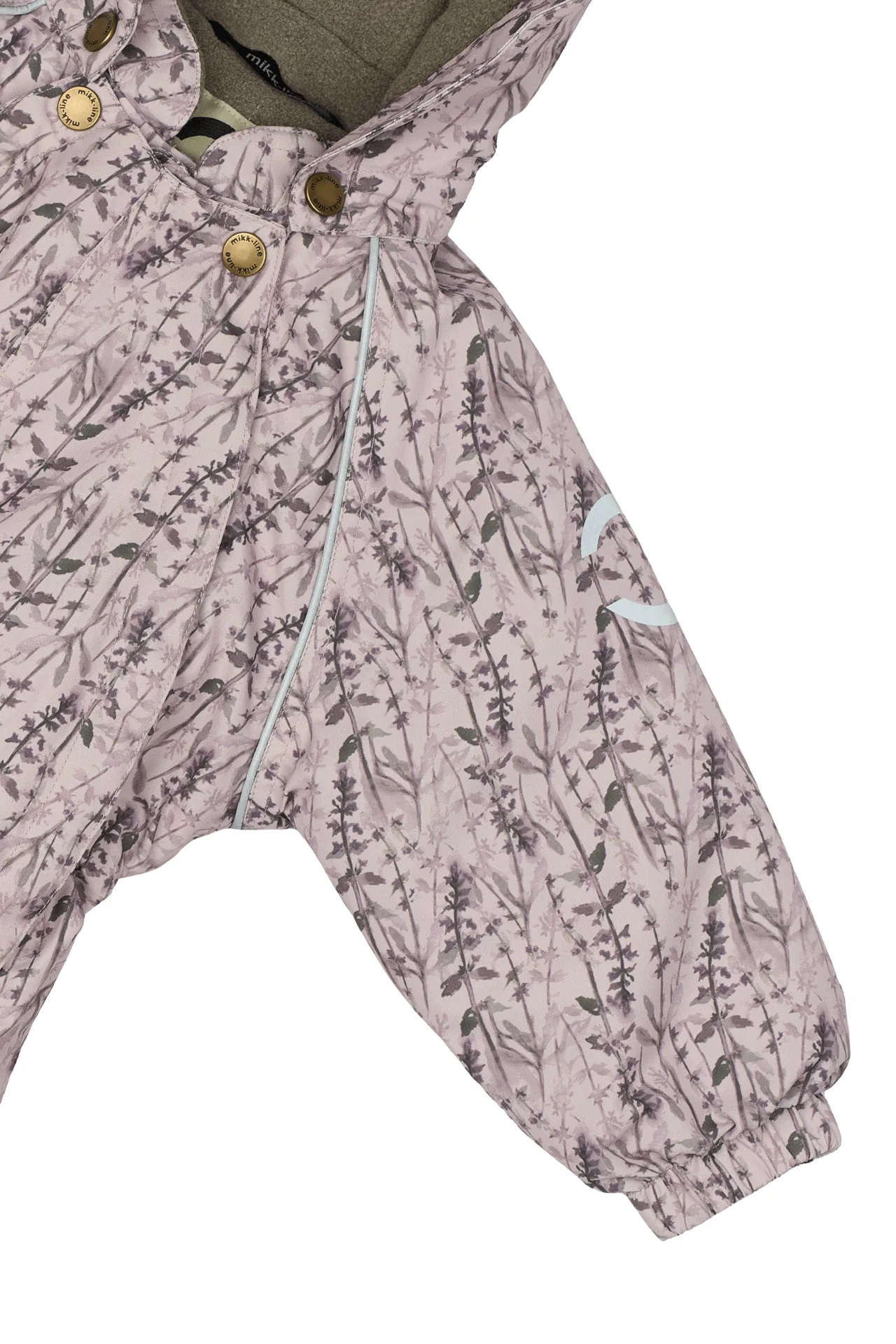 En flot Mikk-Line flyverdragt i støvet rosa med et flot blomstret mønster.