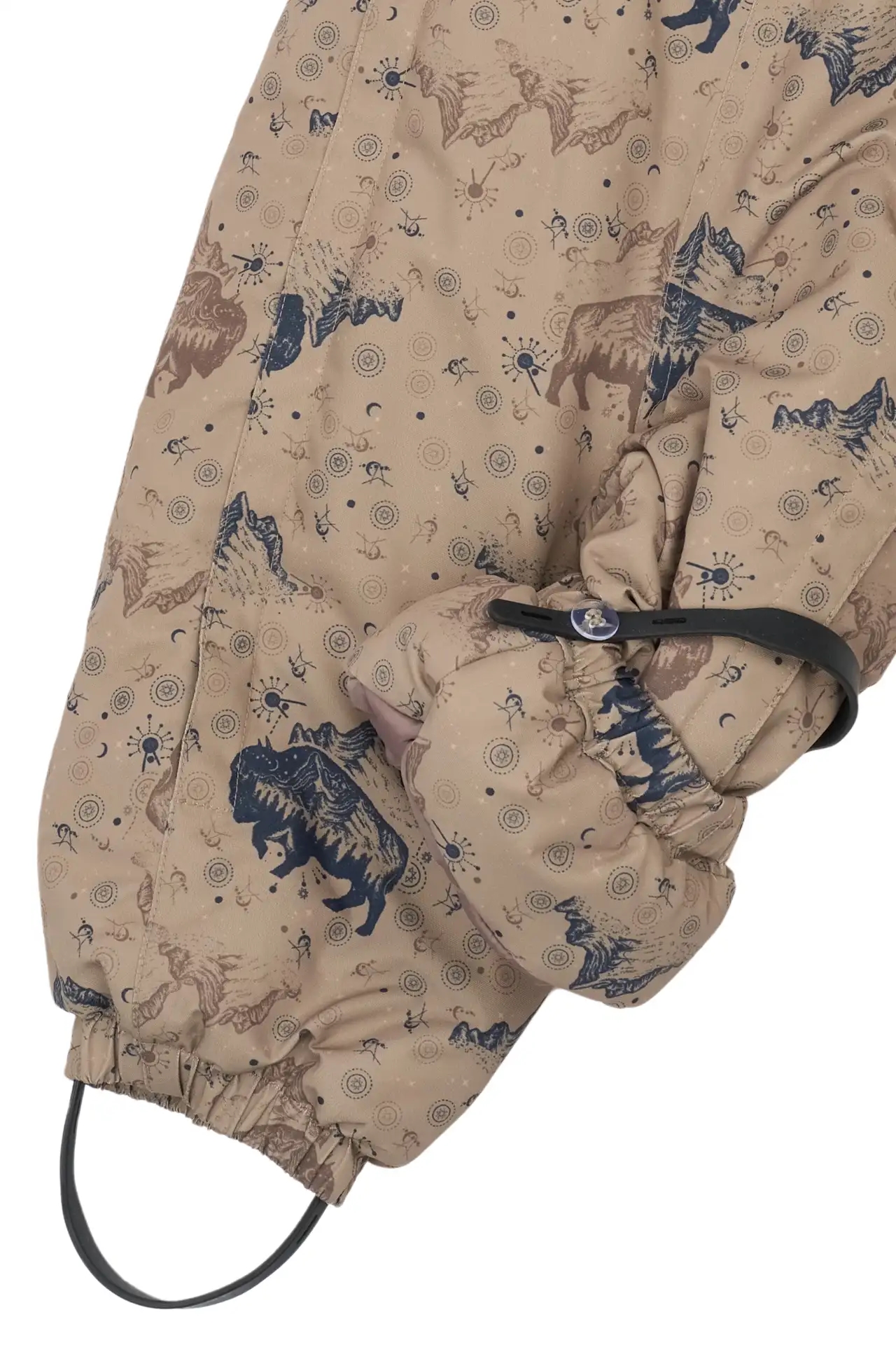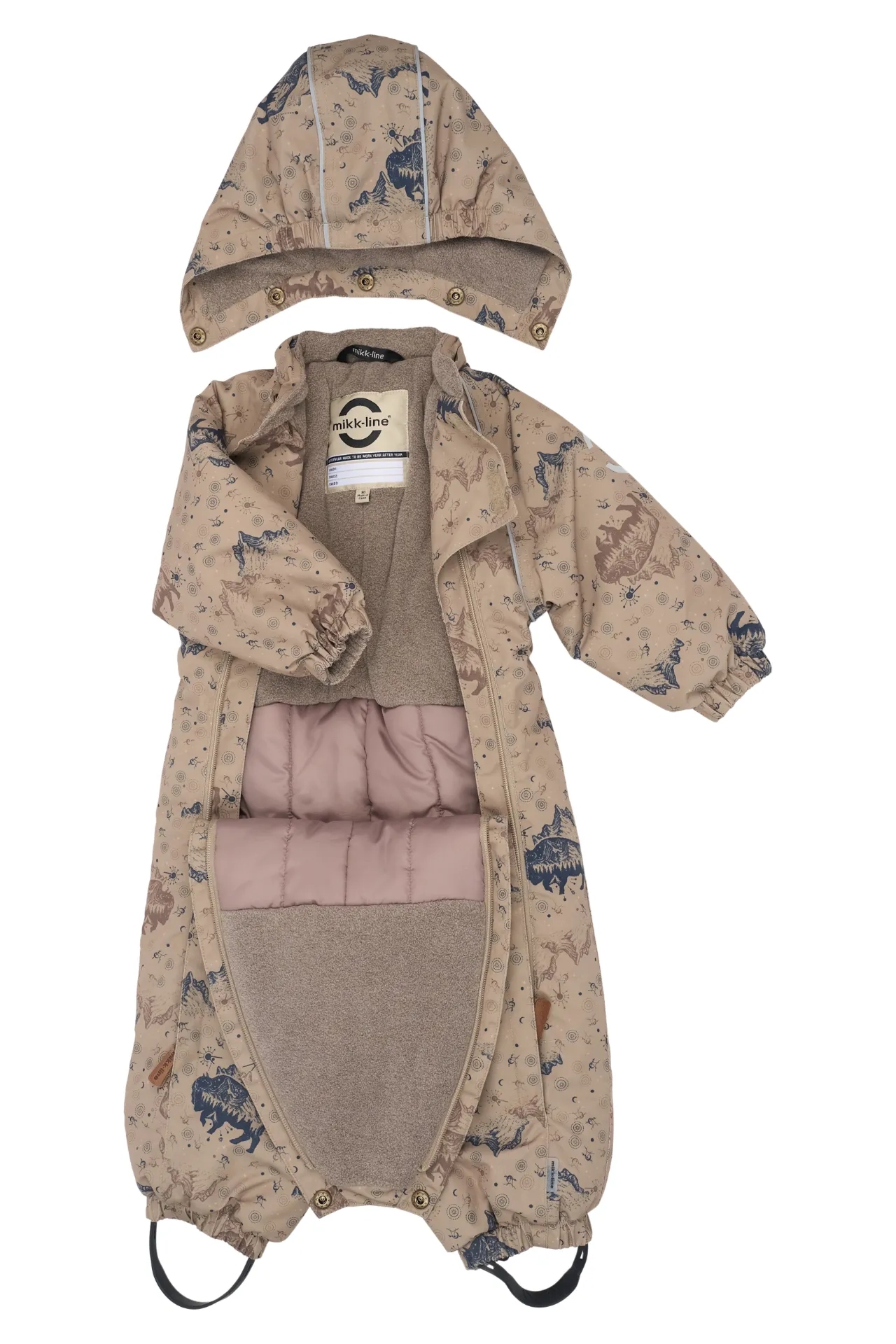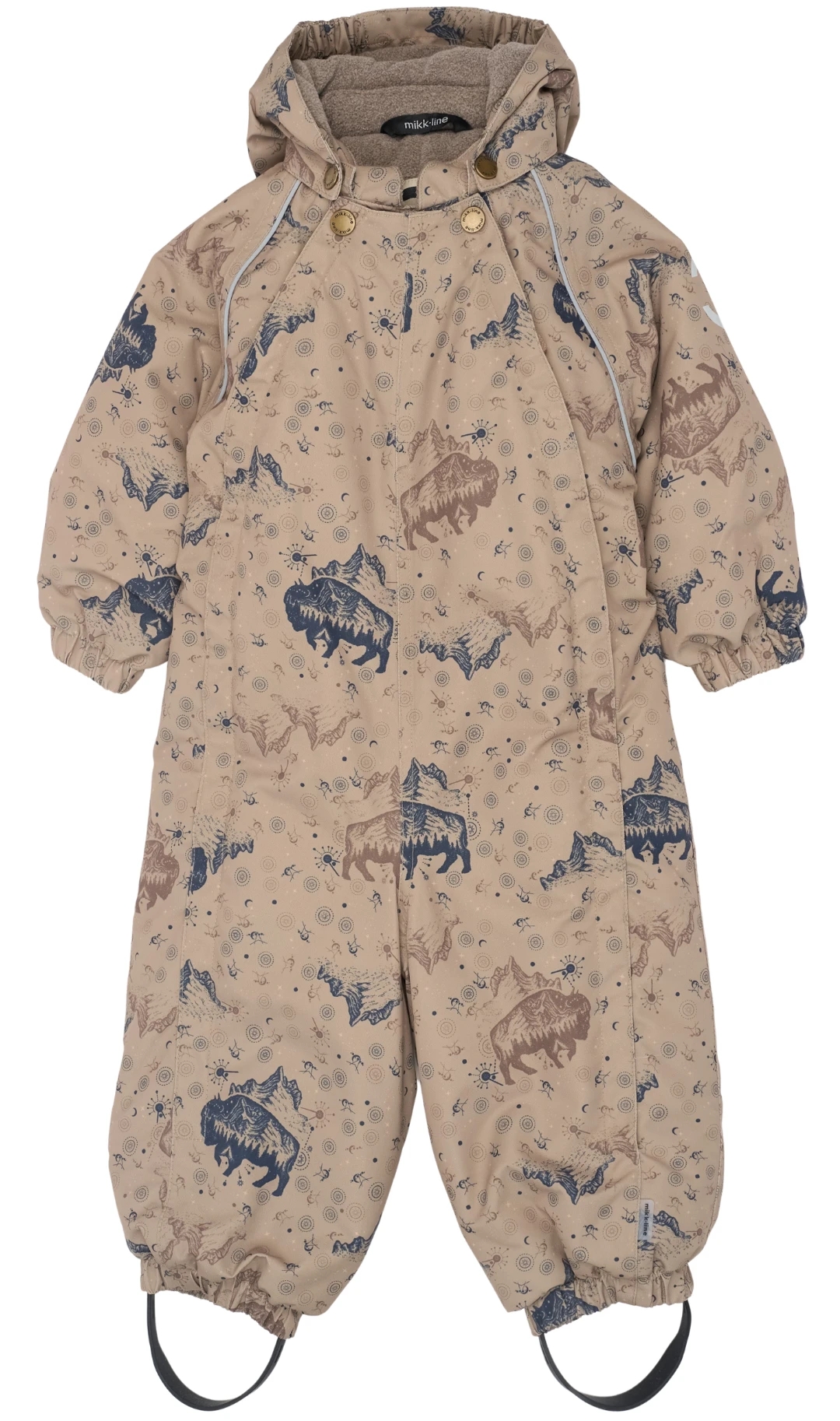 En Mikk-Line flyverdragt med bundfarve i beige-brun med et grønt skær med 'wild life' print med bl.a. bisonokser og klipper i brune og blå farver.