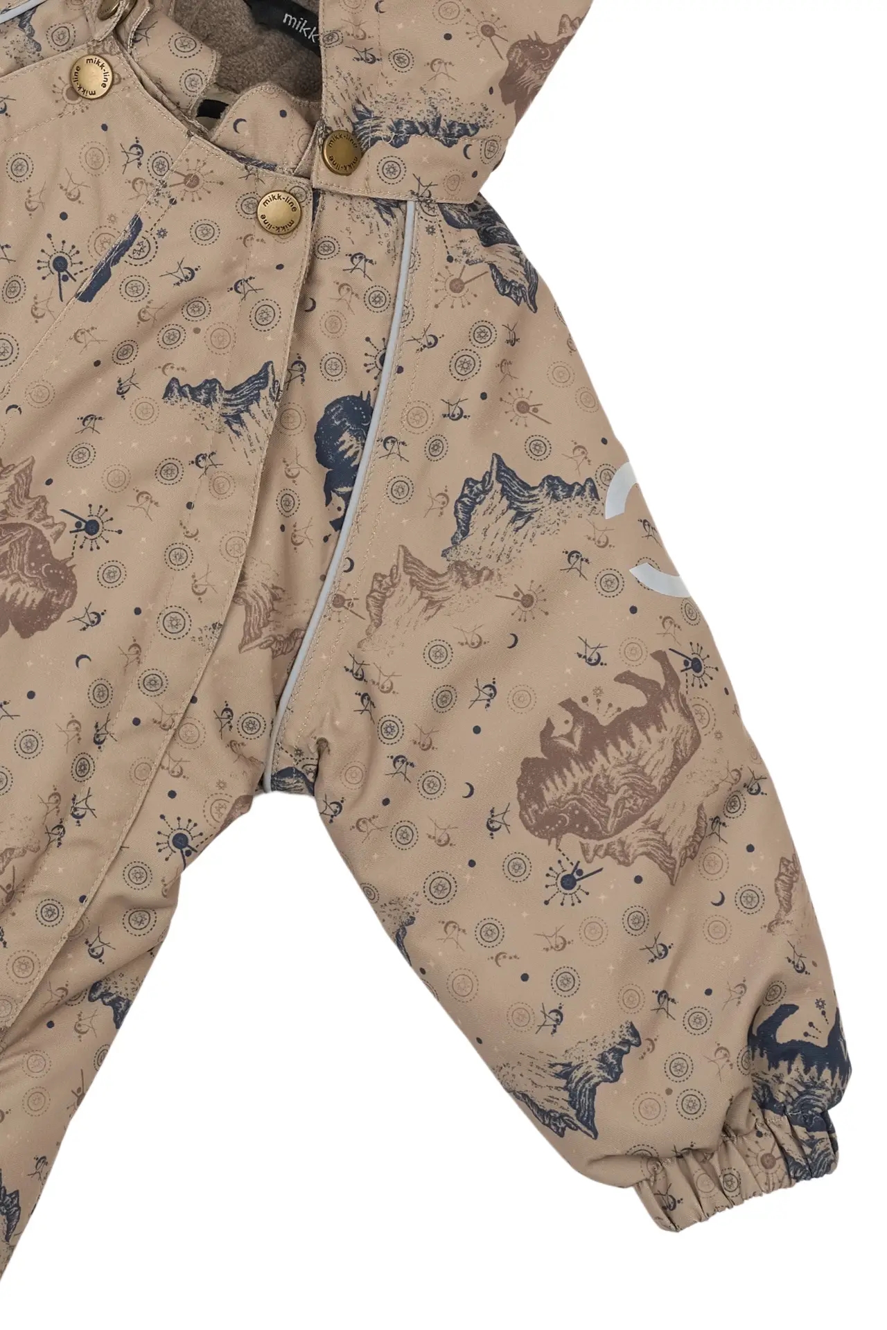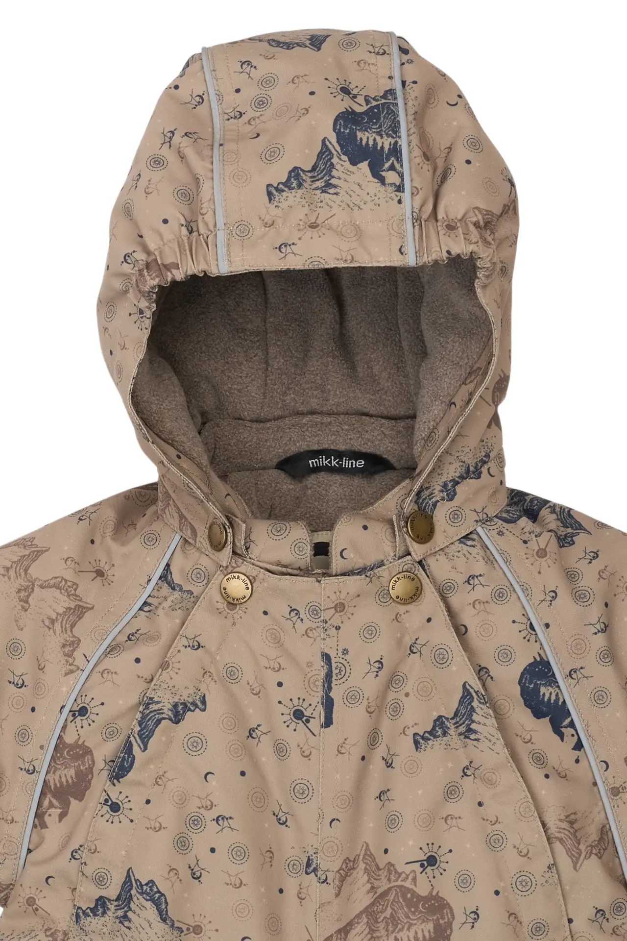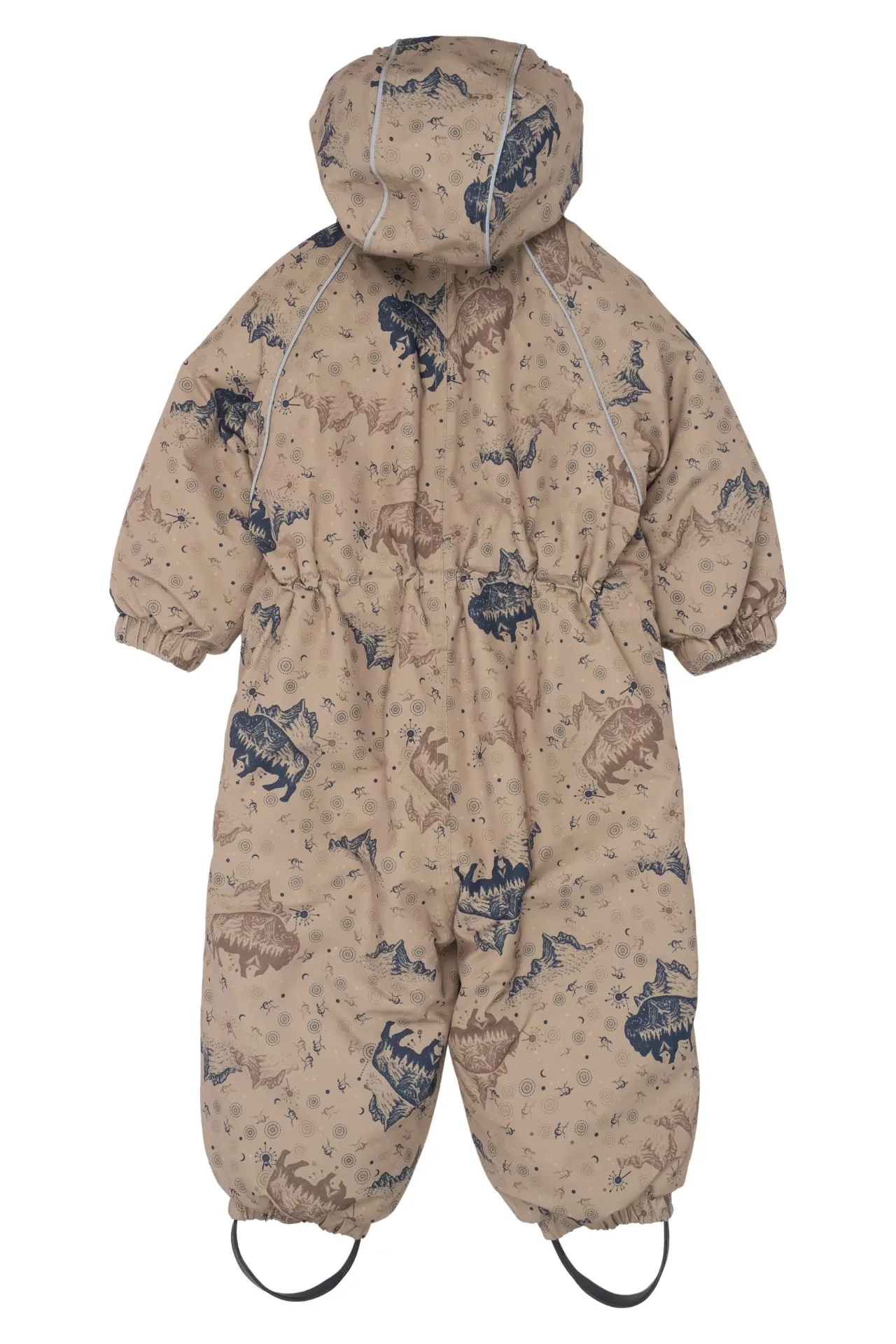 En Mikk-Line flyverdragt med bundfarve i beige-brun med et grønt skær med 'wild life' print med bl.a. bisonokser og klipper i brune og blå farver.