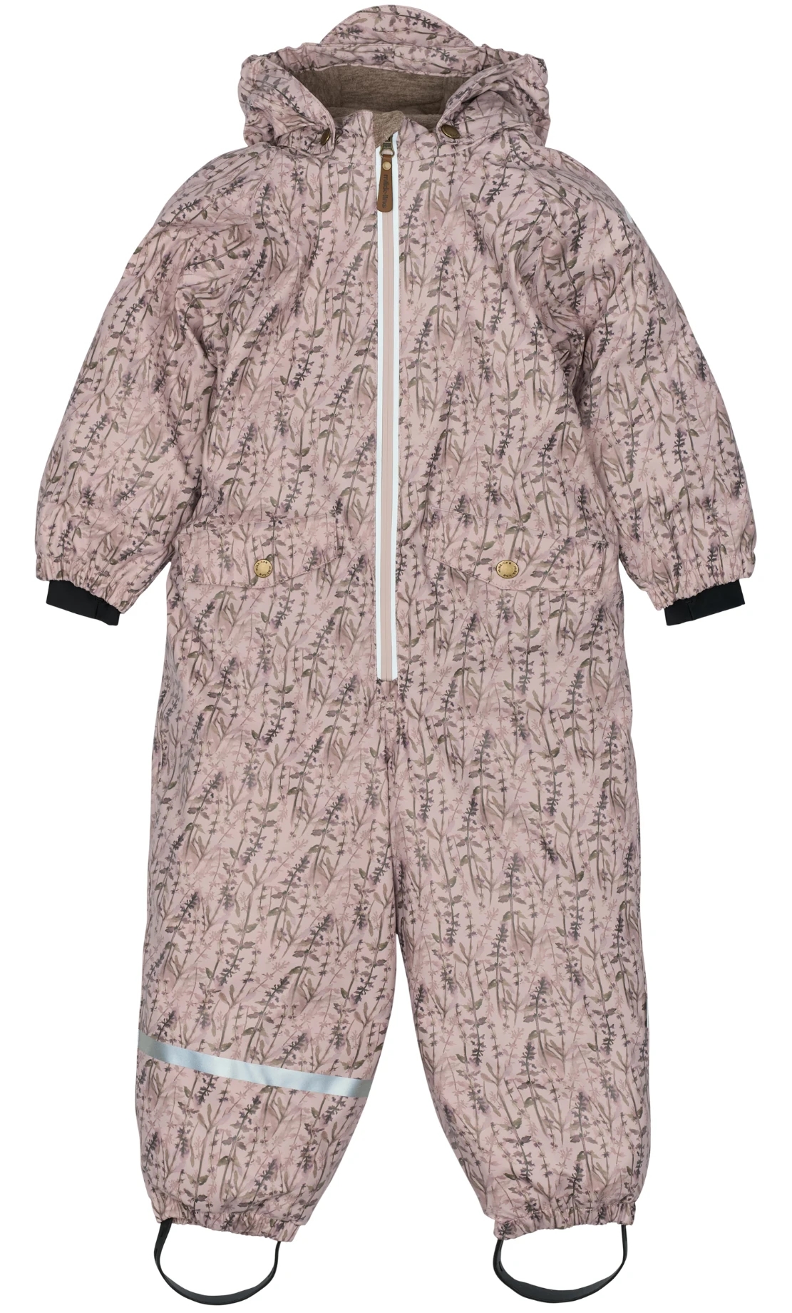En praktisk og flot Mikk-Line flyverdragt lavet i vandtæt PU i rosa med et fint blomsterprint.
