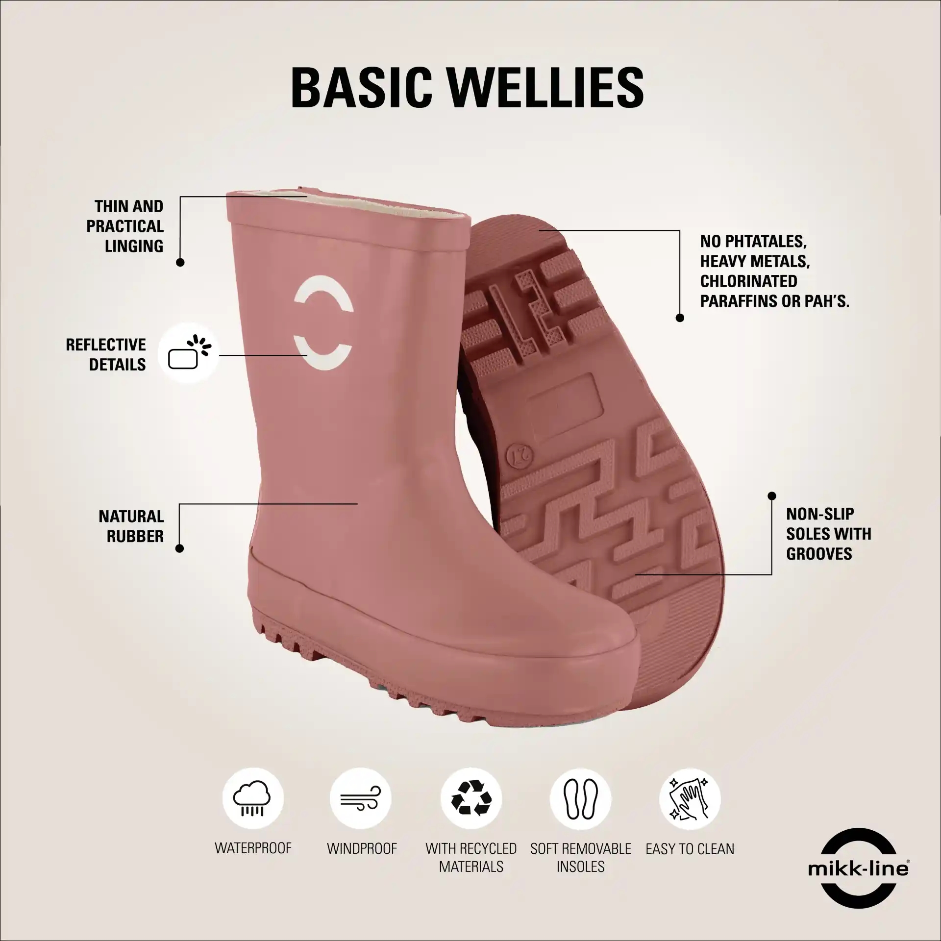 Mikk-Line gummistøvlerne er foret indvendigt, hvilket giver varme til fødderne. I bunden af gummistøvlen er der en blød og udtagelig sål. Gummistøvlen er vandtæt og holder derfor dit barns fødder tørre og rene.