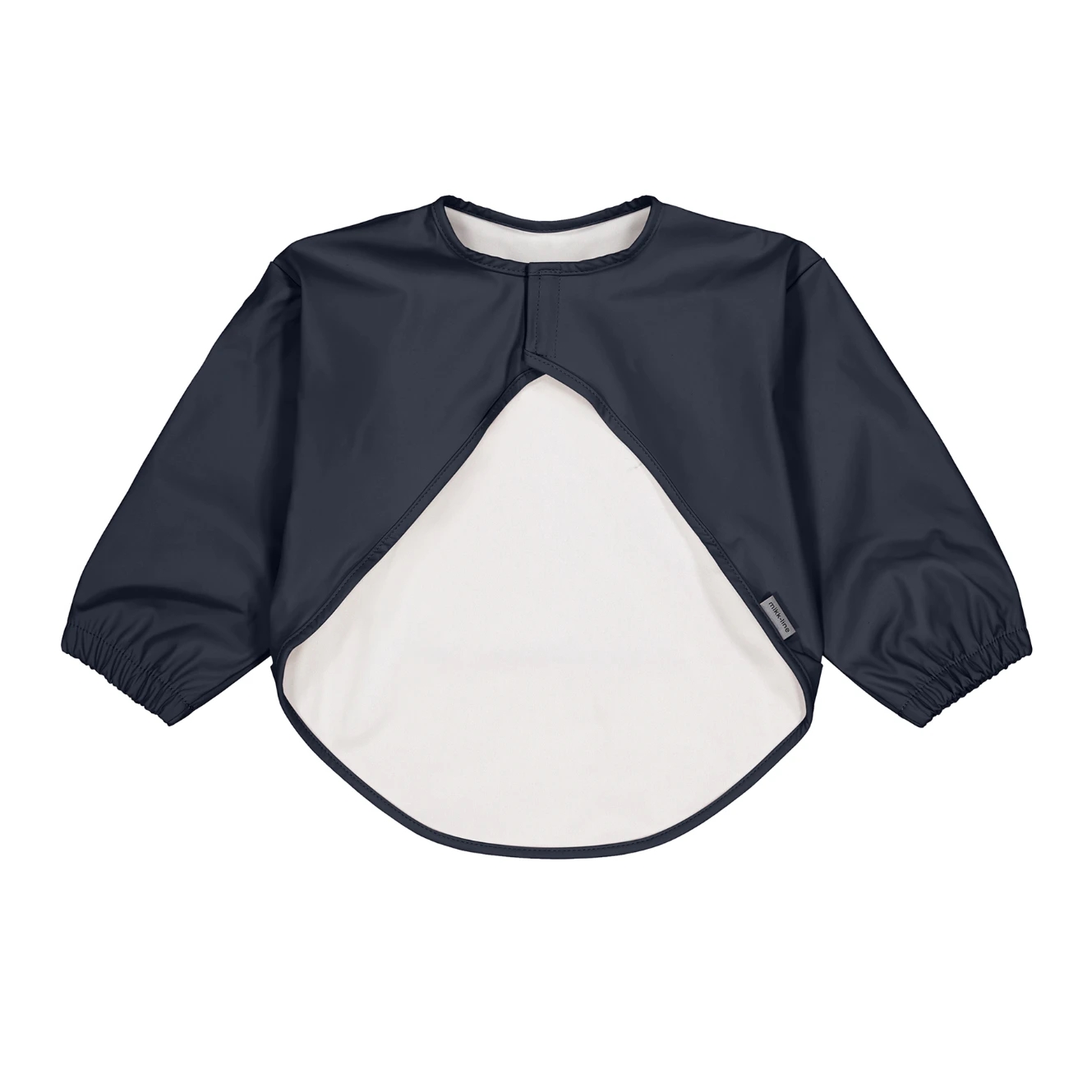 Mikk-Line hagesmækken har lange ærmer med elastikkanter. Den lukkes i nakken med velcro.