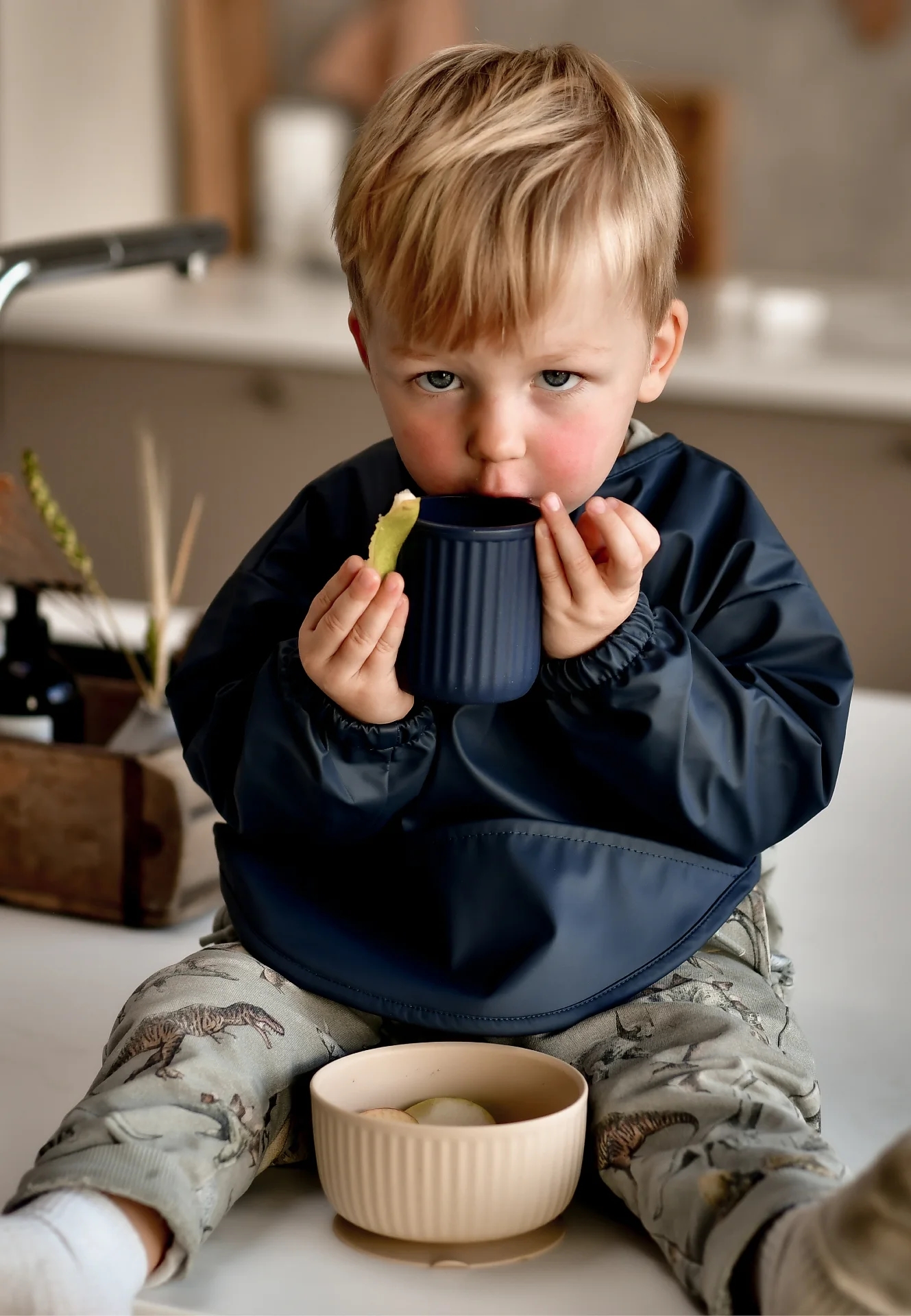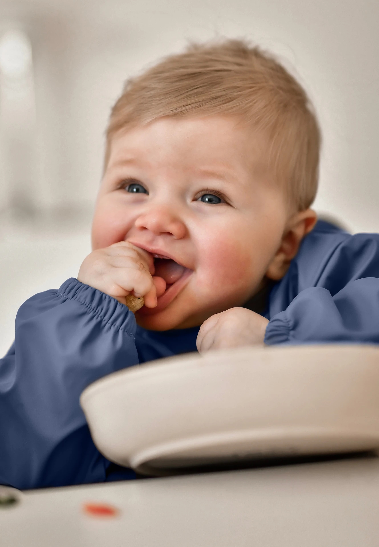 Hagesmækken har en praktisk lomme foran til opsamling af spildt mad og drikke, så tøjet kan skånes.