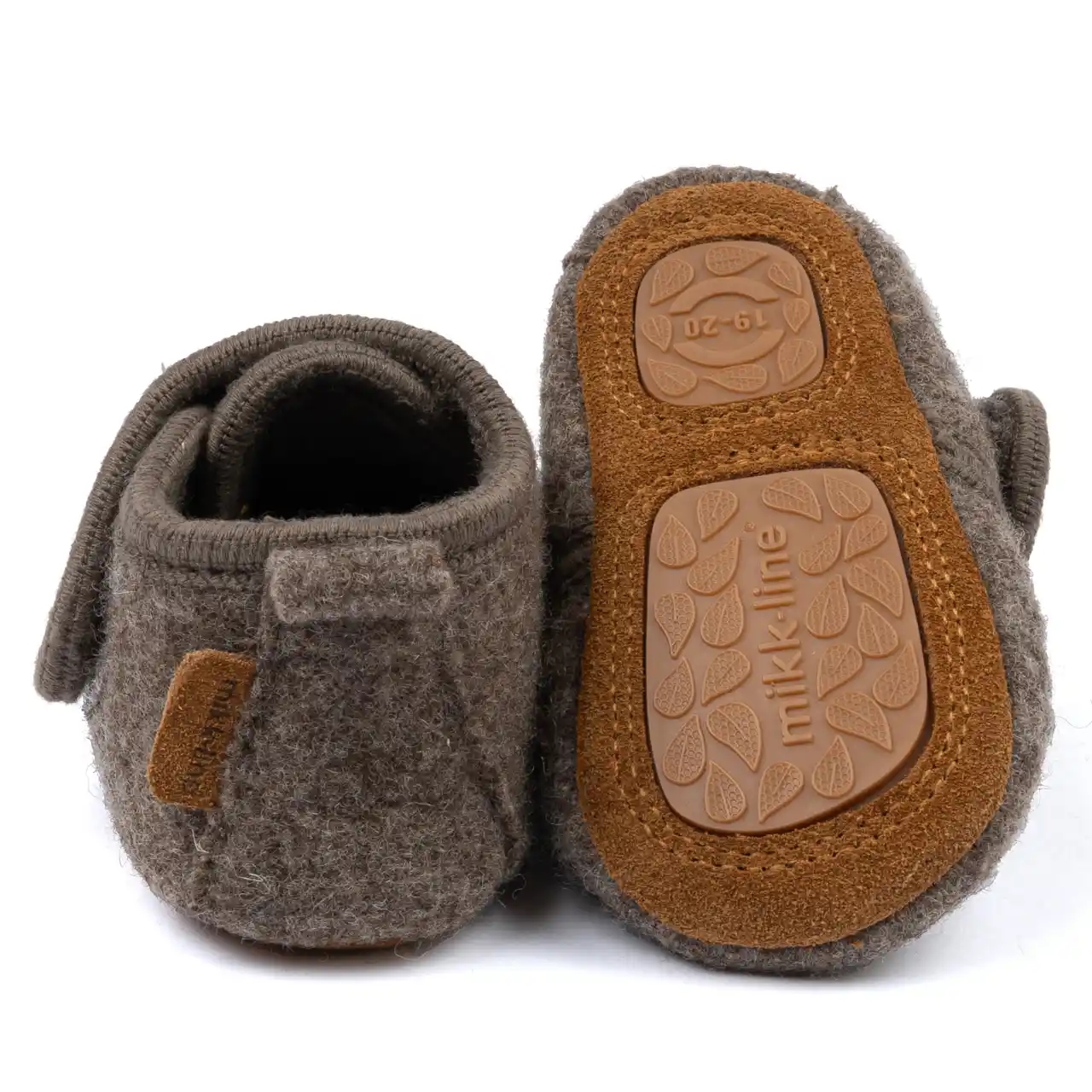 Mikk-Line hjemmeskoene lukkes med en velcrorem over vristen, så de nemt og hurtigt kan tilpasses til fødderne. Bagpå er der en kort strop. De er lavet af 100% uld på indersiden og har en ydersål i ruskind og gummi, som sikrer et godt fodfæste indendørs.