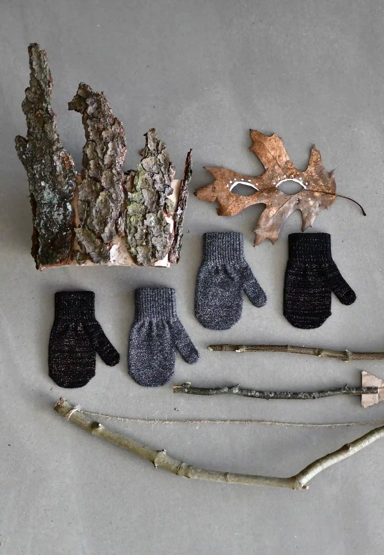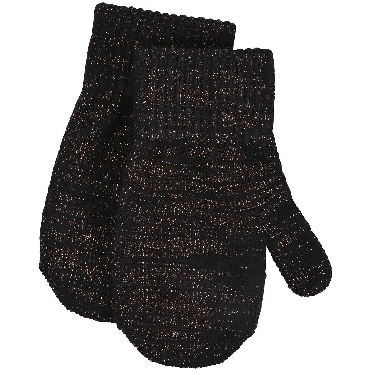 Et par bløde, strikkede Mikk-line luffer i sort med glimmer.