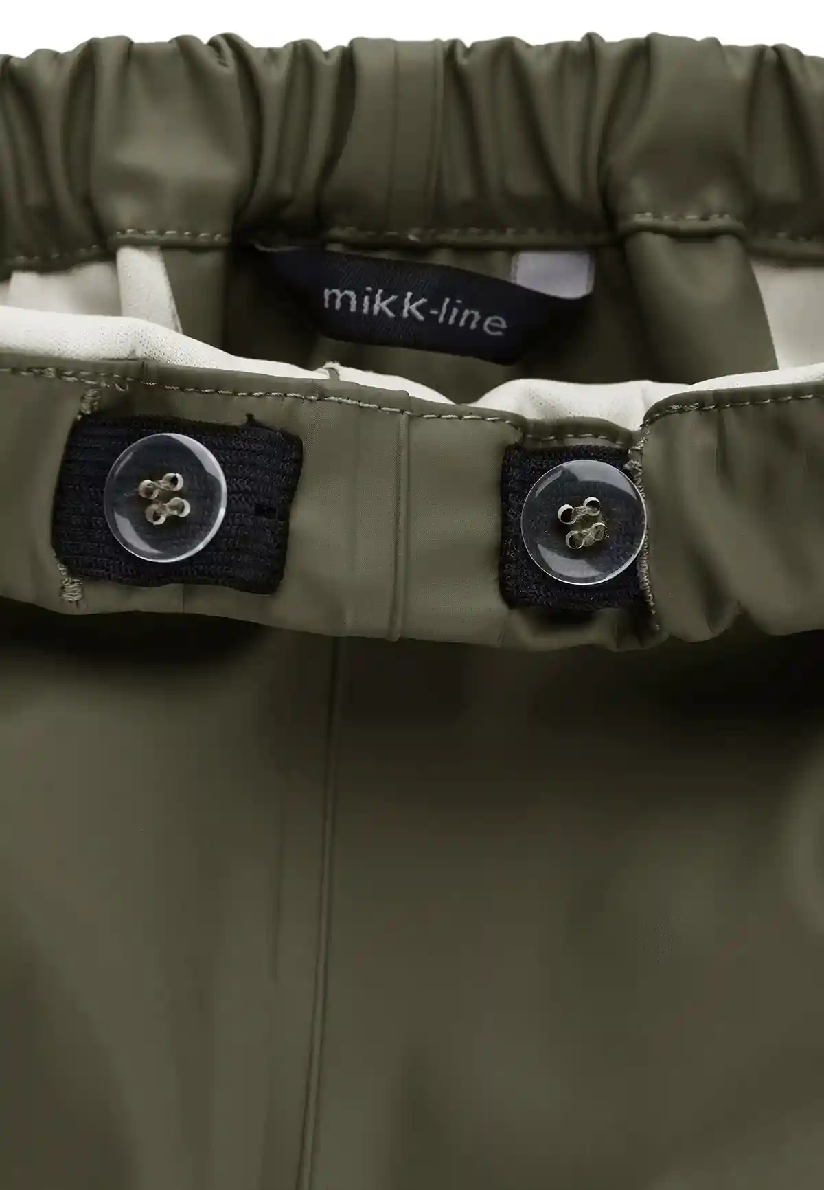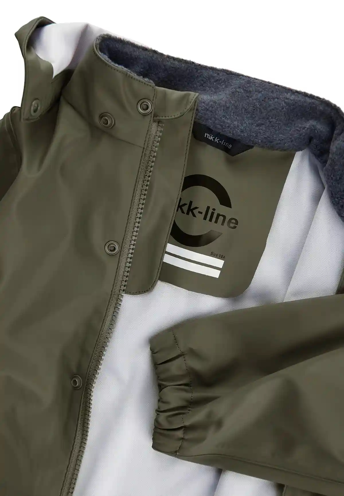 Et praktisk sæt Mikk-Line regntøj i en flot oliven grøn farve, der er 100% vind- og vandtæt.