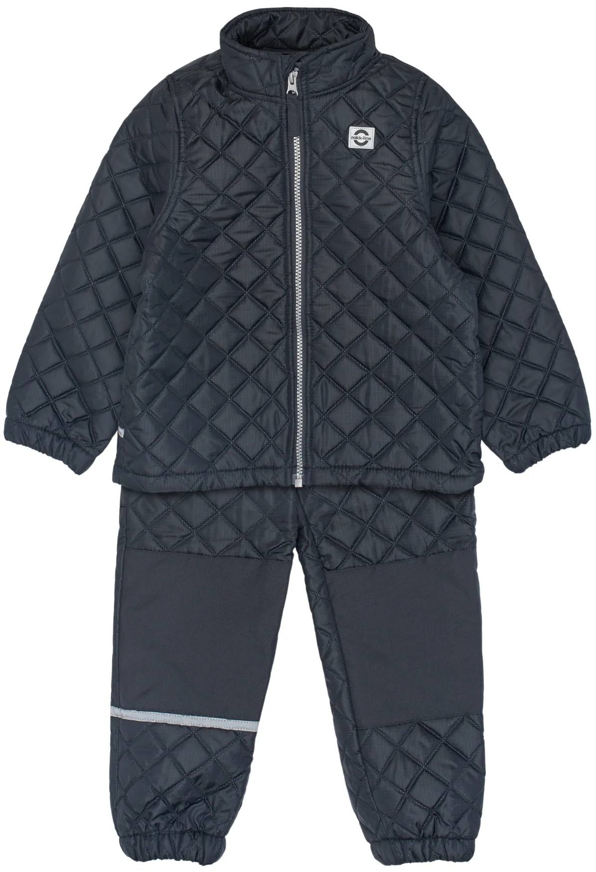 Sættet har ribkanter i ærmer og ben. Jakken lukkes med lynlås og har hagebeskyttelse. Termotøjet har reflekser, så barnet ses. Tøjet har indvendigt navneskilt - praktisk til institutionen.