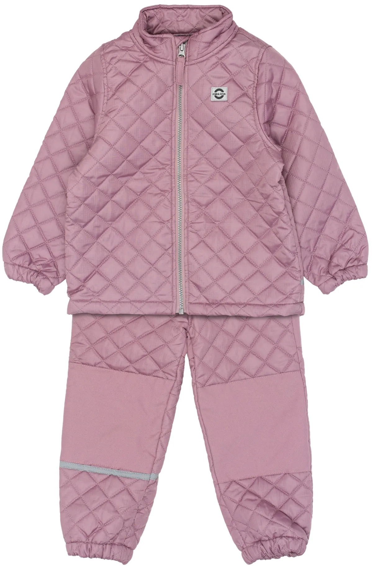 Sættet har ribkanter i ærmer og ben. Jakken lukkes med lynlås og har hagebeskyttelse. Termotøjet har reflekser, så barnet ses. Tøjet har indvendigt navneskilt - praktisk til institutionen.