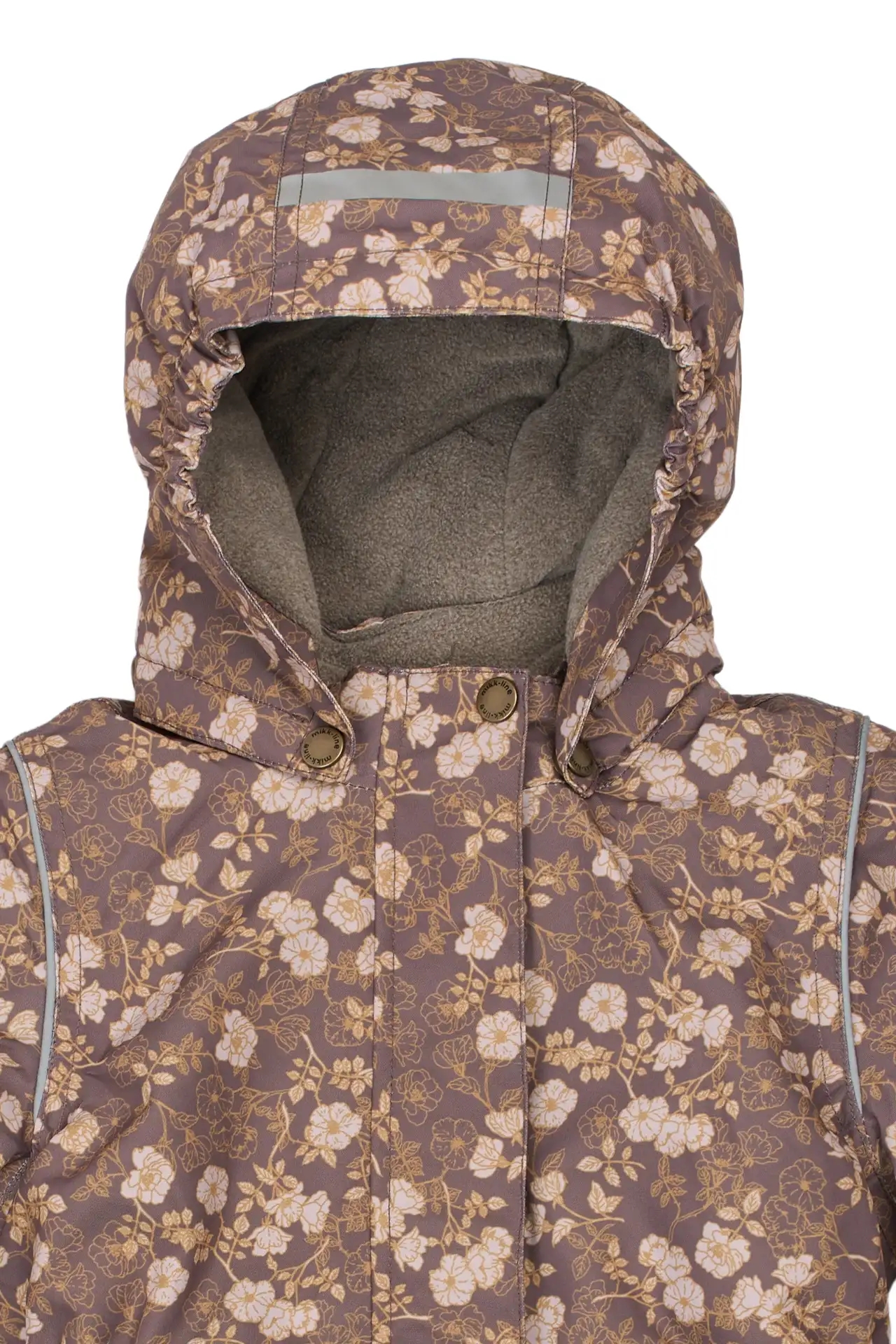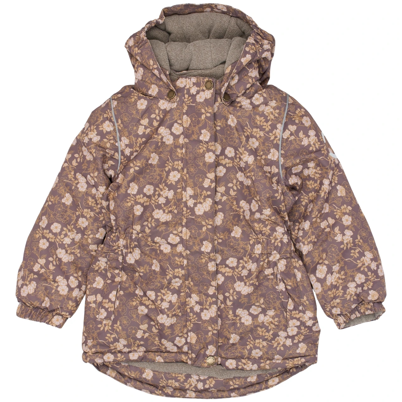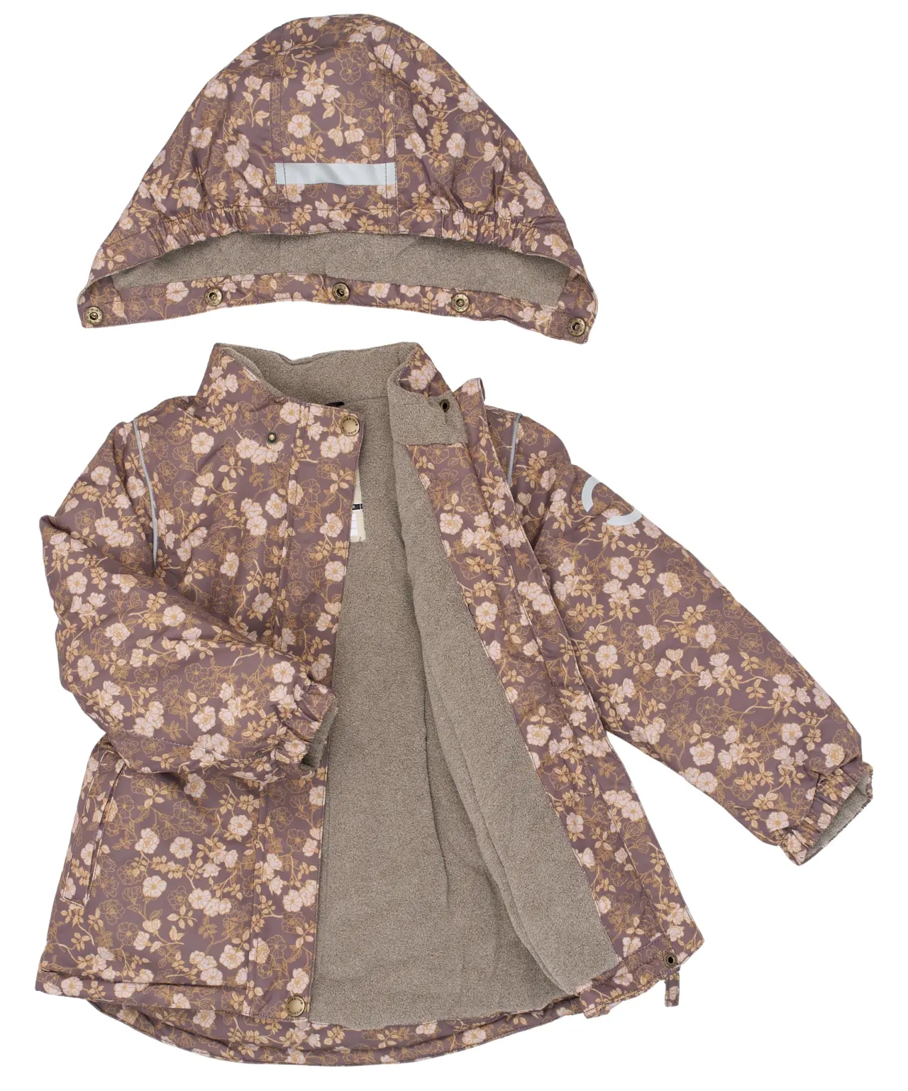 Let og varm Mikk-Line vinterjakke i en flot, afdæmpet og støvet lilla med støvet gul og hvidt blomsterprint.